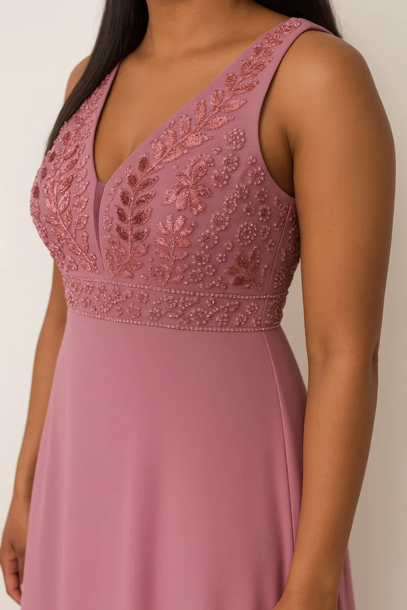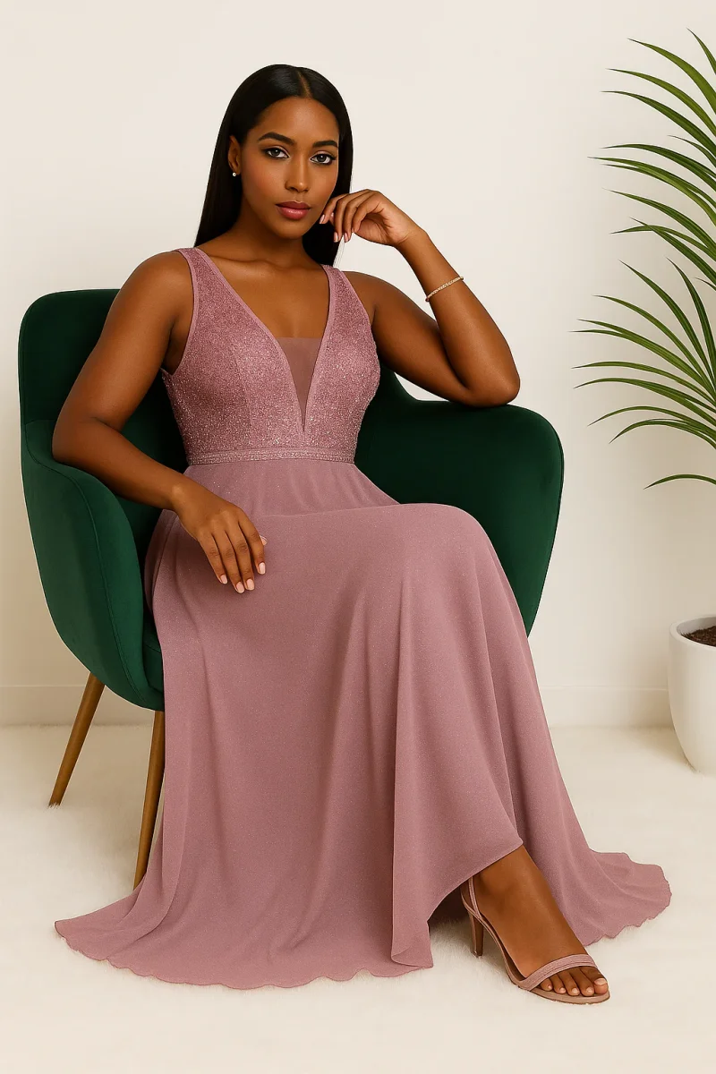 ✨ Robe de soirée longue mauve à haut pailleté et décolleté en V – Élégance raffinée ✨