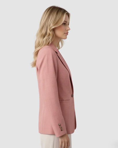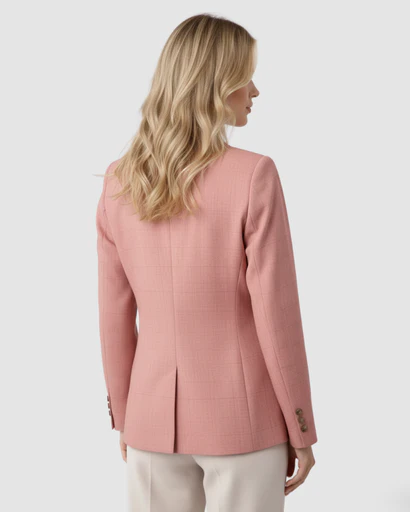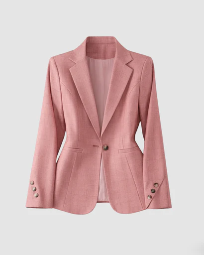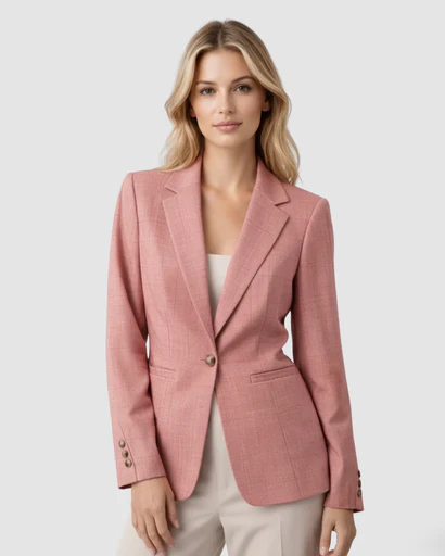Affirmez votre allure avec ce blazer à la coupe impeccablement ajustée, conçu pour sublimer la silhouette féminine. Cette pièce maîtresse se distingue par un tissage délicat à carreaux fins qui apporte une profondeur texturée et une élégance intemporelle à votre garde-robe. Sa structure classique est rehaussée par un col à revers cranté et une fermeture centrale à bouton unique, créant un équilibre parfait entre rigueur professionnelle et modernité. Les détails soignés, tels que les poches passepoilées discrètes et les poignets ornés de trois boutons décoratifs, témoignent d’une finition haut de gamme.