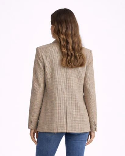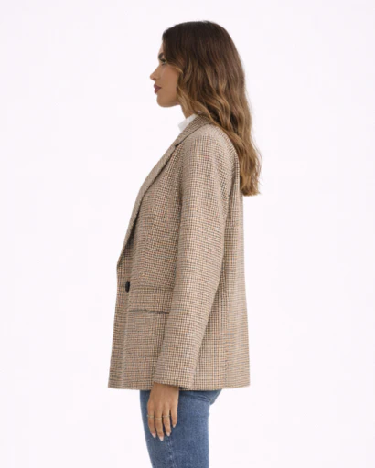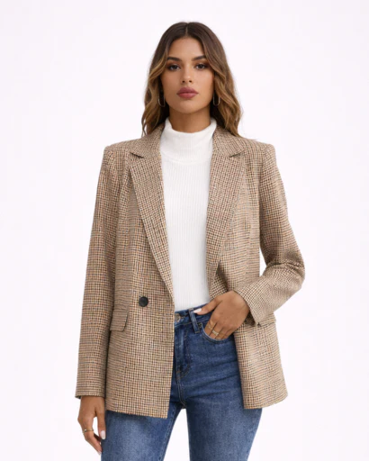 Ce blazer pour femme se distingue par sa coupe droite et structurée, offrant une allure moderne et élégante. Le motif à carreaux apporte une touche classique revisité, idéale pour composer une tenue chic du quotidien. Les épaules légèrement définies et les lignes nettes soulignent sa silhouette sophistiquée. Le blazer présente une fermeture à deux boutons visibles ainsi que des poches à rabat, ajoutant une dimension pratique à son style. Porté ici avec un jean ajusté, il crée un contraste harmonieux entre décontraction et raffinement, parfait pour le bureau comme pour une sortie habillée.