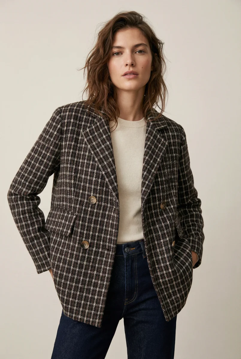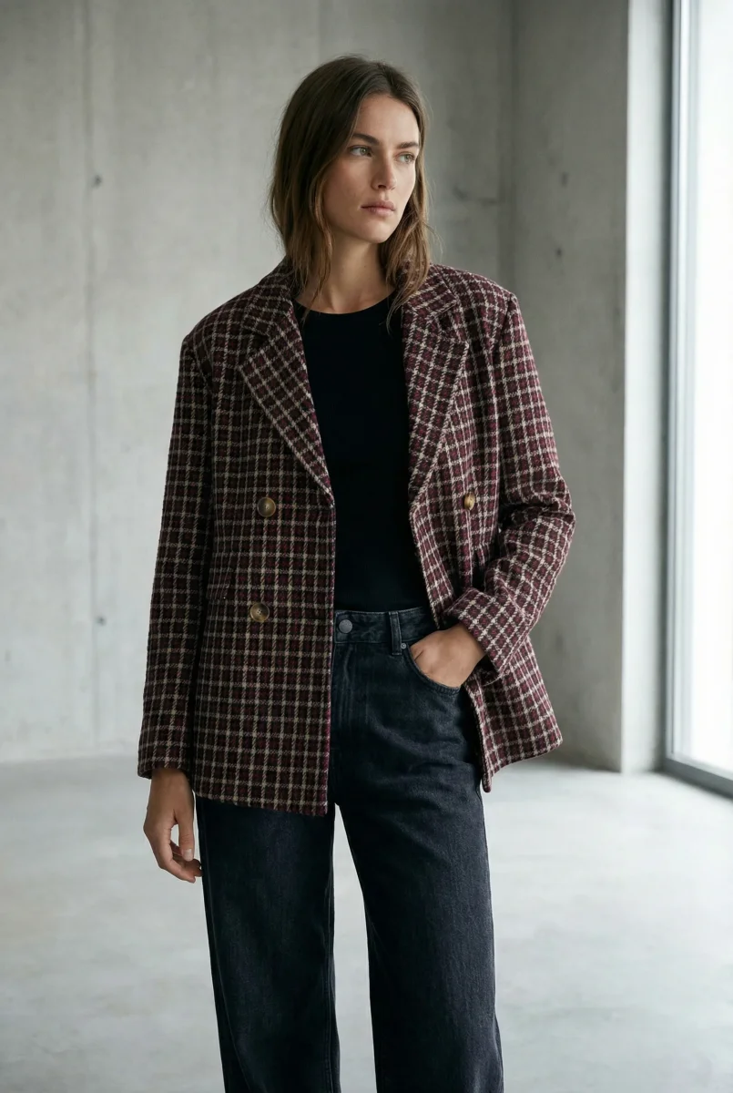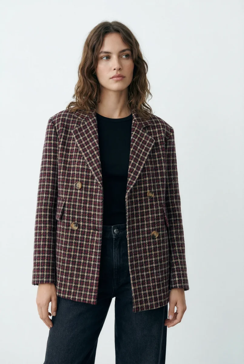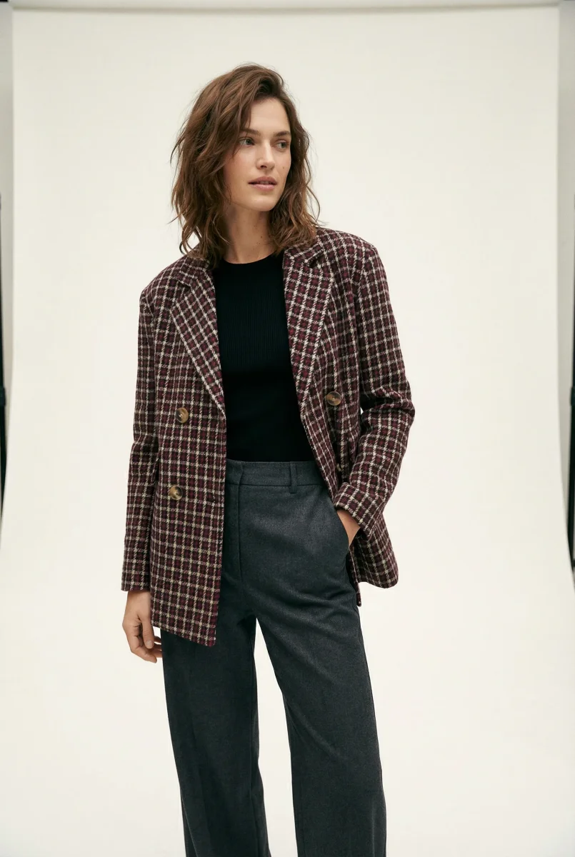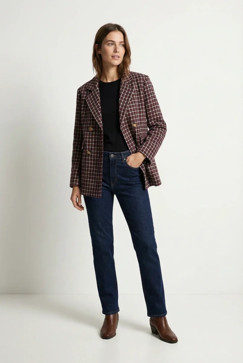 Disponible en bordeaux et marron, ce blazer femme en coton structuré s’associe facilement avec des tons neutres comme le noir, le beige ou le denim. Tailles disponibles : S, M et L.