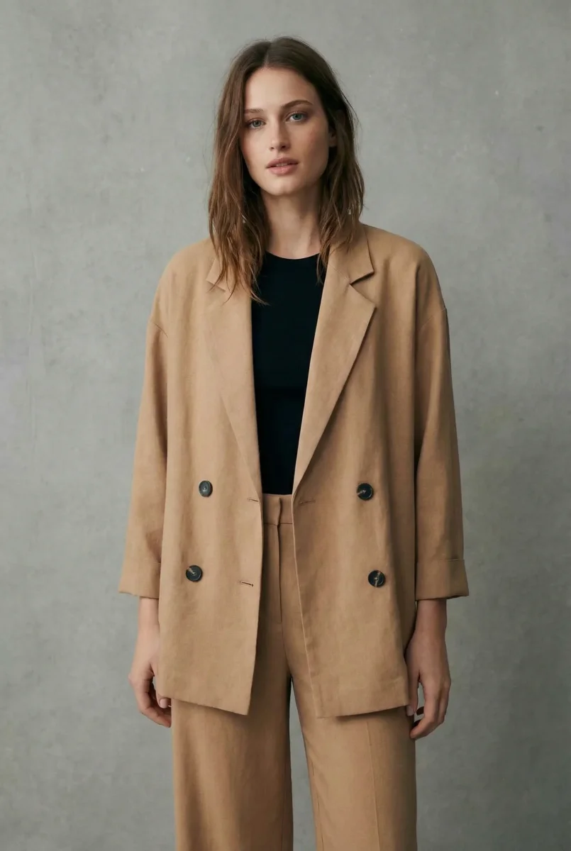 Transformez votre garde-robe avec ce blazer fluide croisé en couleur camel. Conçu pour allier confort et sophistication, ce blazer oversize est l’ajout parfait à toute tenue, qu’elle soit professionnelle ou décontractée. Son tissu léger offre une allure chic tout en permettant une mobilité sans contrainte. La coupe ample et le double boutonnage noir ajoutent une touche moderne et élégante, vous garantissant de vous démarquer avec style.