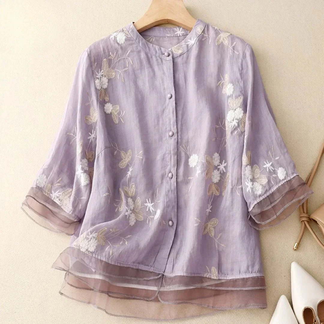 Découvrez la blouse brodée élégante à manches mi-longues, une pièce qui marie avec finesse délicatesse artisanale et allure contemporaine. Sa coupe fluide, ses broderies florales et ses détails en organza font de cette blouse un incontournable pour une garde-robe estivale raffinée.