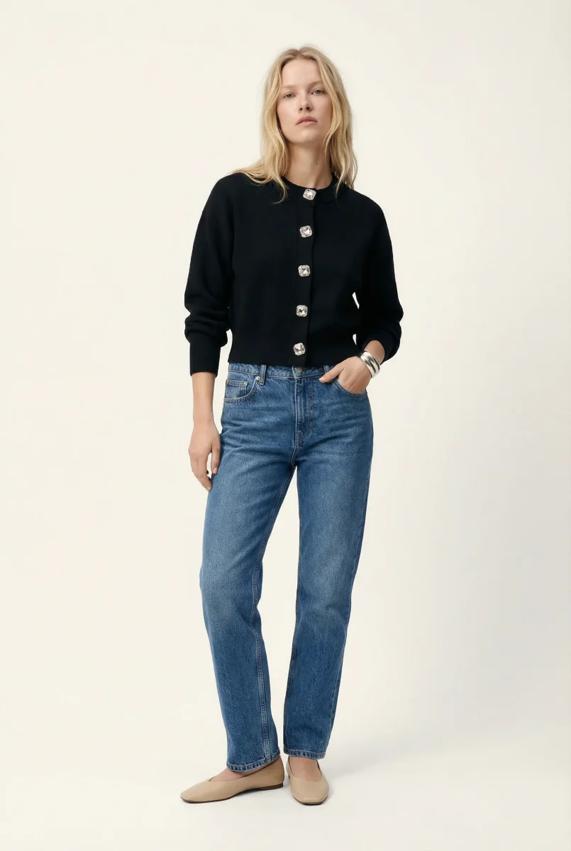 - Portez ce cardigan noir femme avec un jean taille haute pour un look chic et moderne.