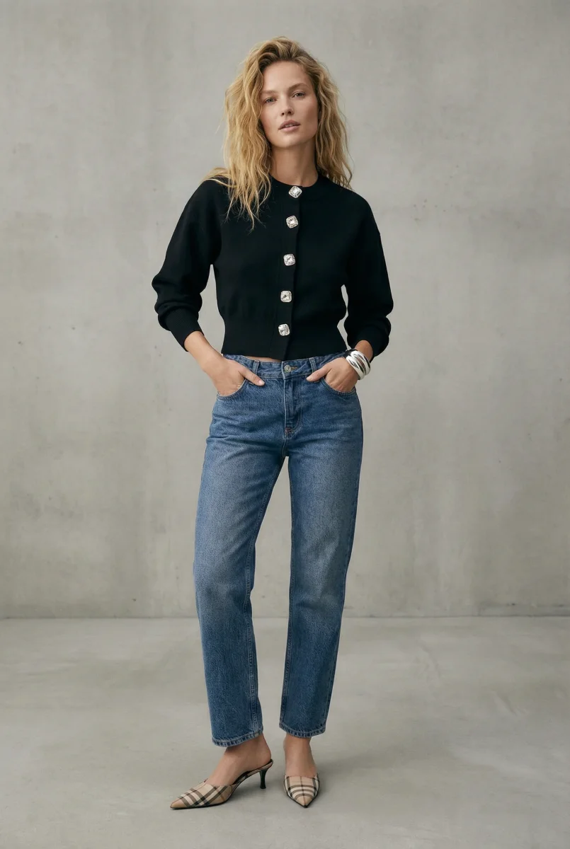 - Superposez-le sur un top minimaliste pour mettre en valeur ses boutons bijoux.