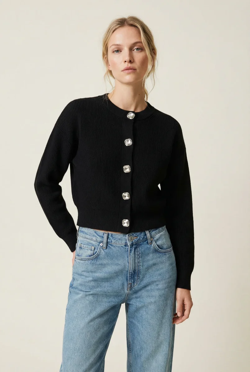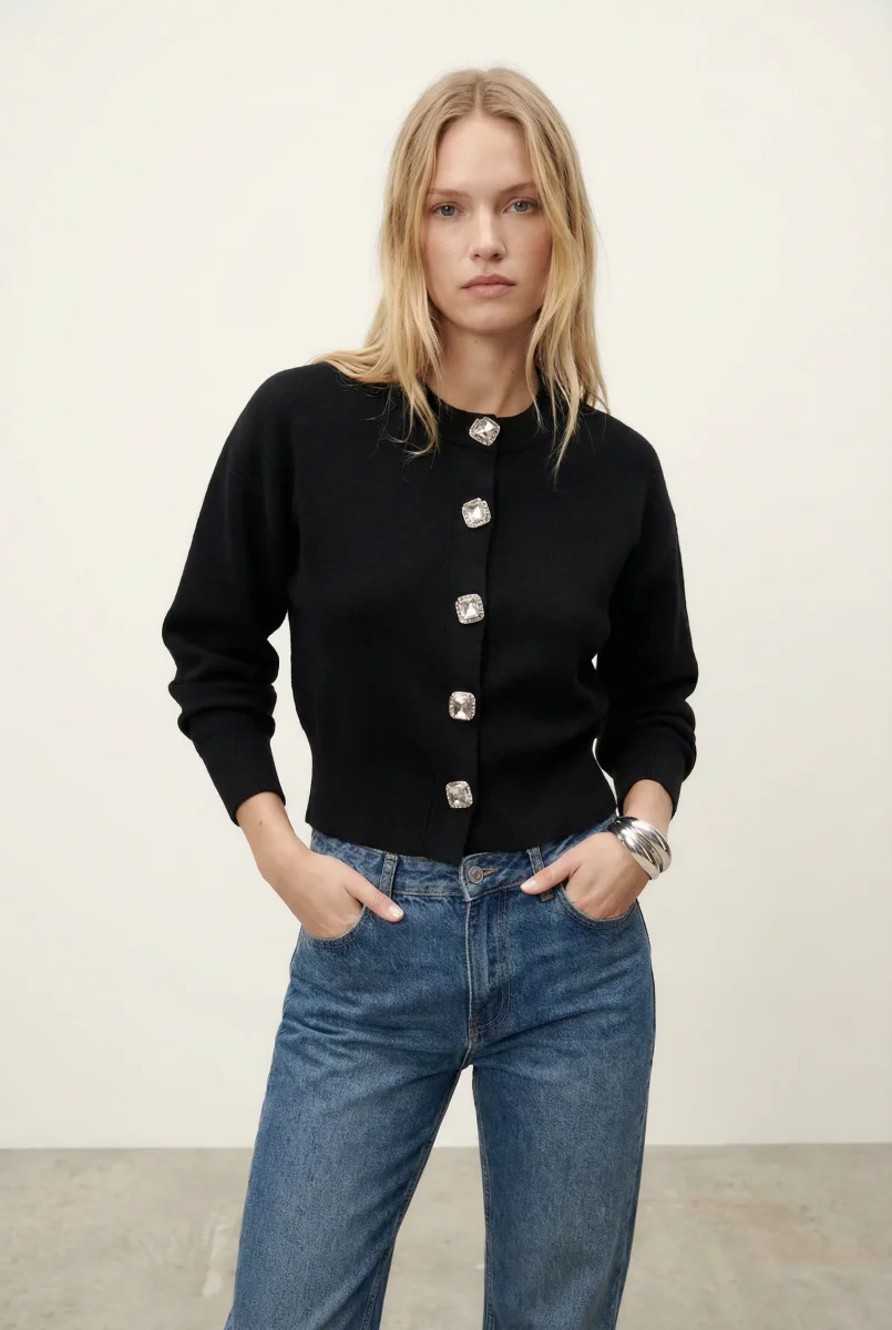 Ce cardigan noir femme se distingue par sa maille épaisse et son design minimaliste sublimé par des boutons sculptés, apportant une touche premium à vos tenues quotidiennes. La coupe courte modernise la silhouette et permet de l’associer facilement à un jean taille haute, un pantalon élégant ou une jupe midi.