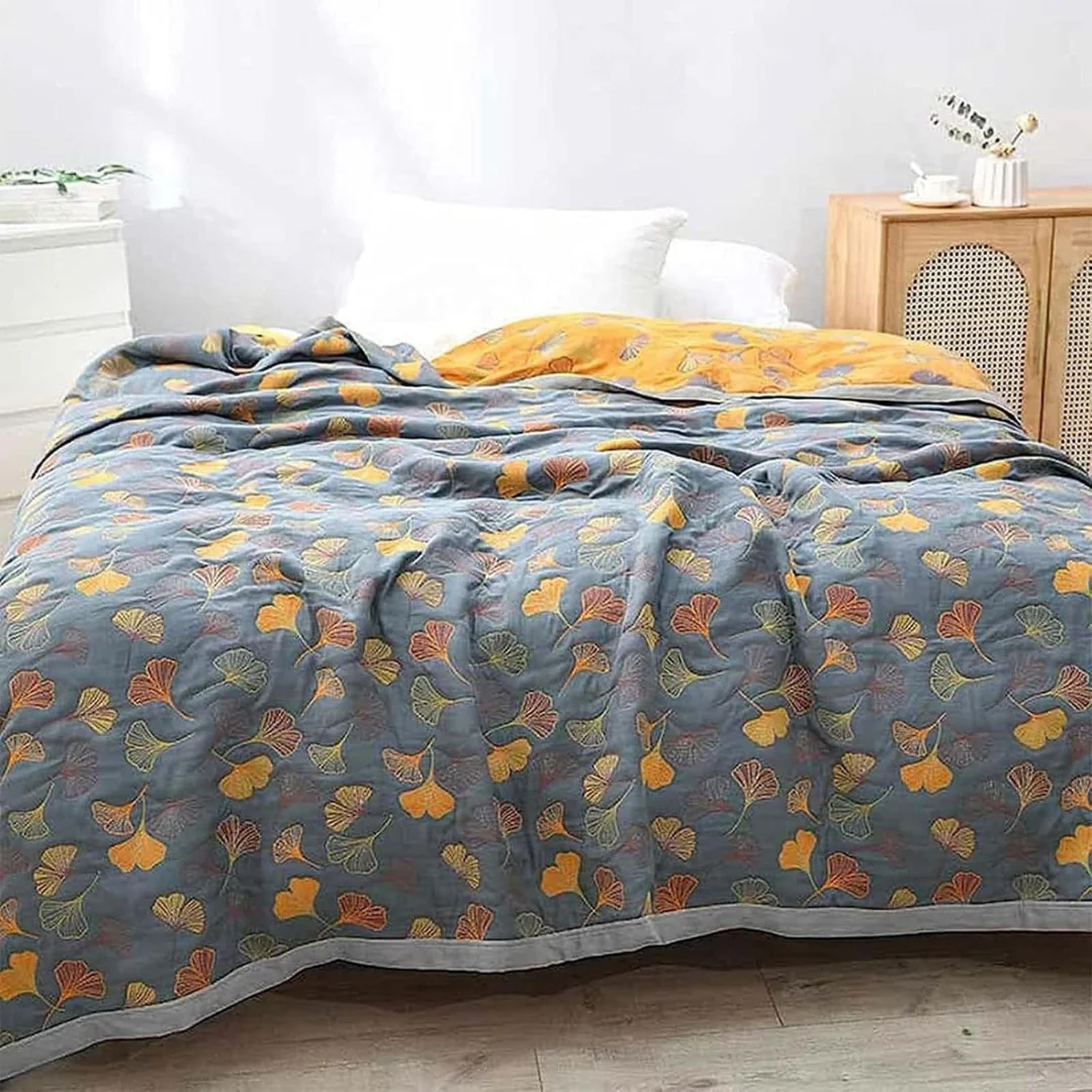Profitez d’un mélange parfait de confort et de style grâce à cette couverture réversible avec un magnifique motif de feuilles de ginkgo. Conçue dans des tons vibrants de jaune et de bleu, cette couverture en coton ajoute une élégance naturelle à votre intérieur tout en offrant une chaleur douillette pour la détente, que ce soit sur le canapé, le lit ou en voyage.