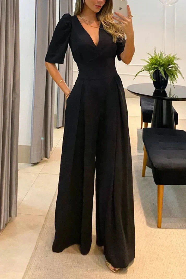 Élégante Combinaison Femme Large Jambe Décolleté en V Manches Longues | Idéal pour l’automne