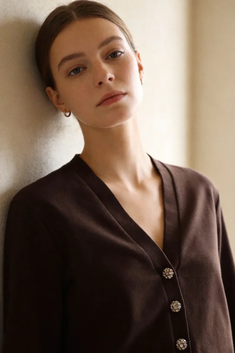 - Veste col V avec manches longues et boutons en relief