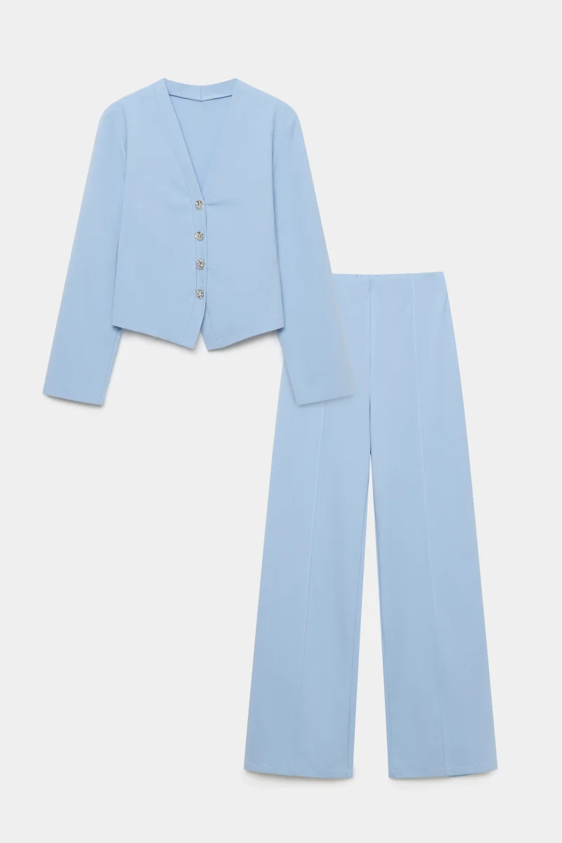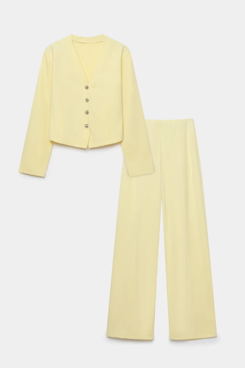 La veste se distingue par son col en V élégant, ses manches longues et ses boutons en relief qui apportent une finition soignée. Le pantalon complète l’ensemble avec une taille élastique confortable, une coupe à mi-taille et une bande frontale structurante qui affine visuellement la silhouette. Cet ensemble coordonné permet de composer un look harmonieux sans effort.