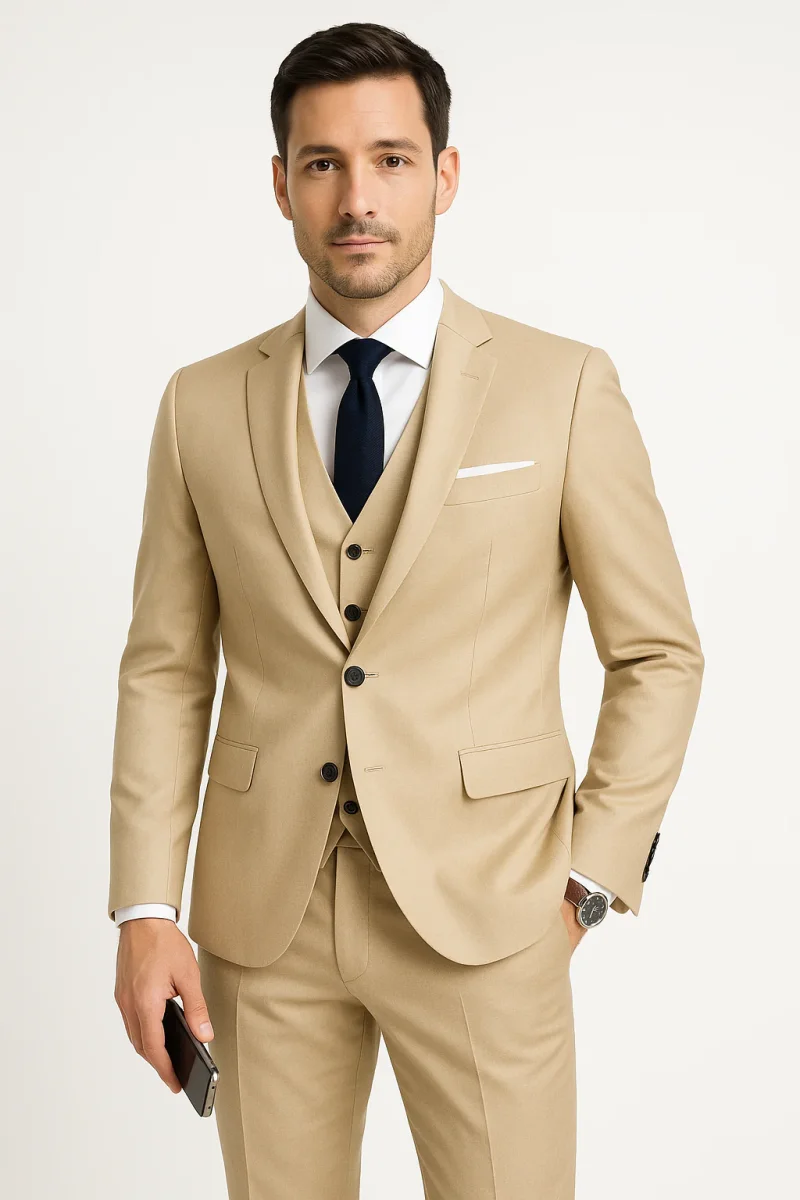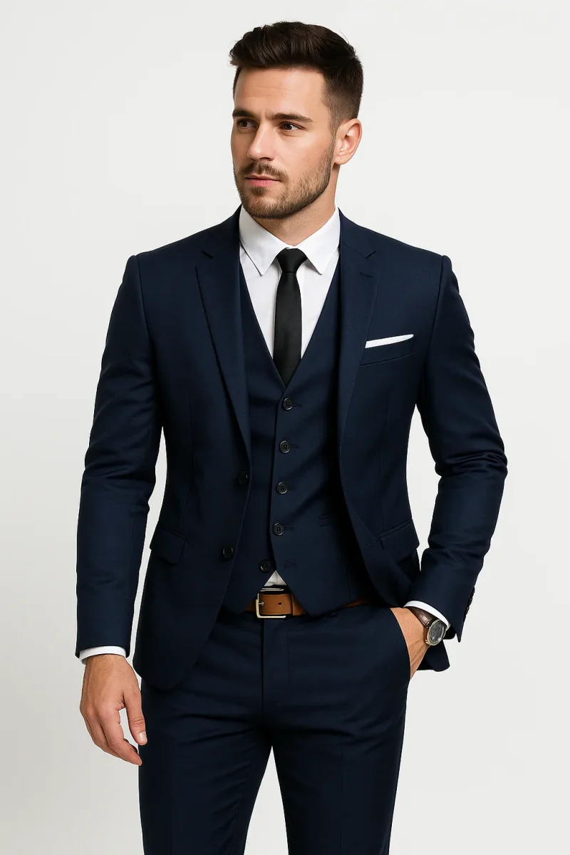 - Trois pièces : blazer à col montant, gilet classique et pantalon confortable à taille élastique