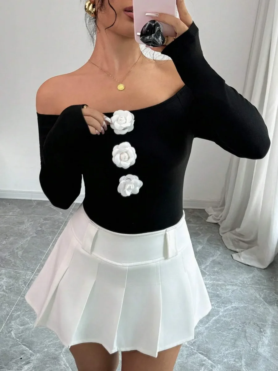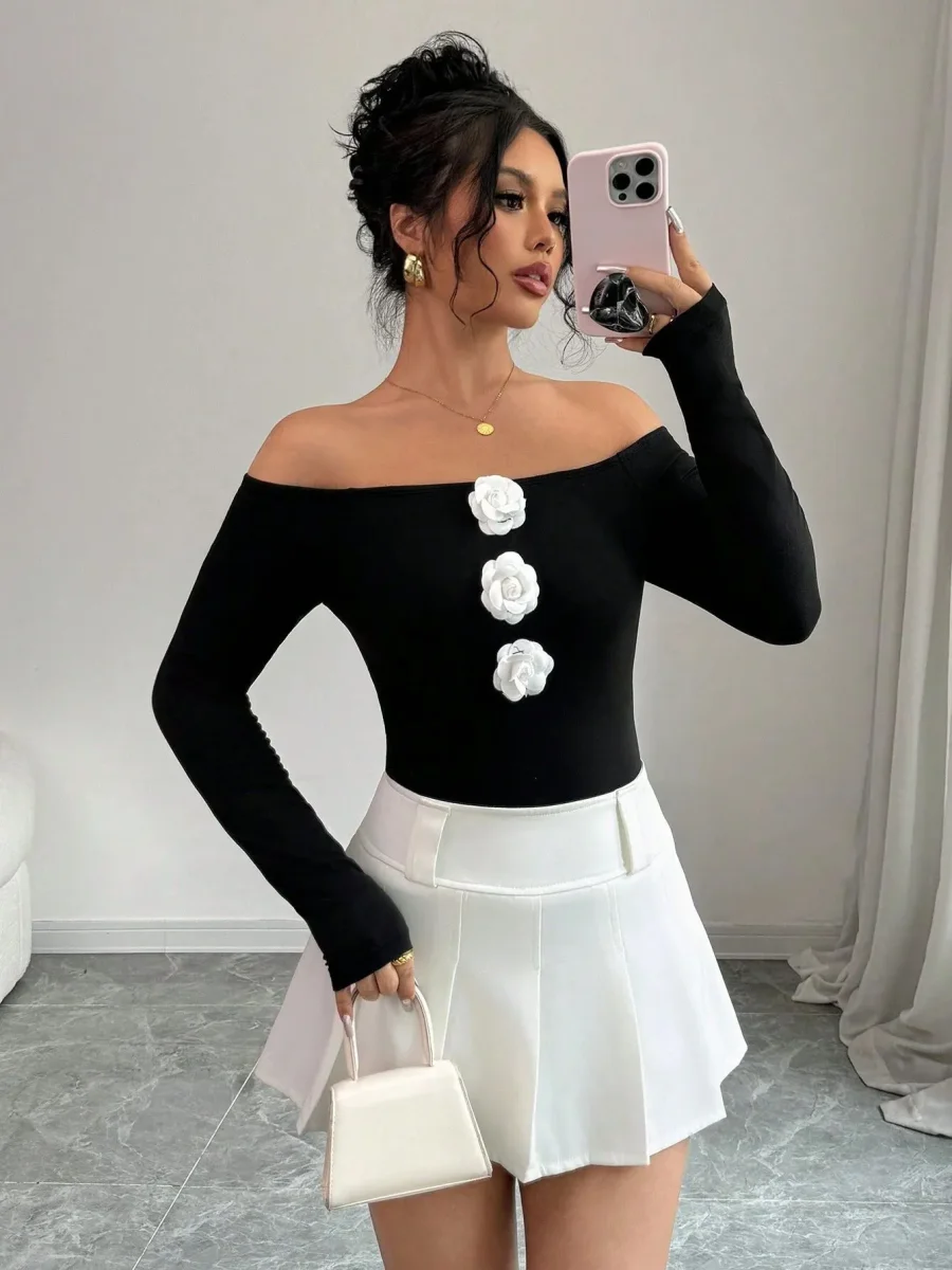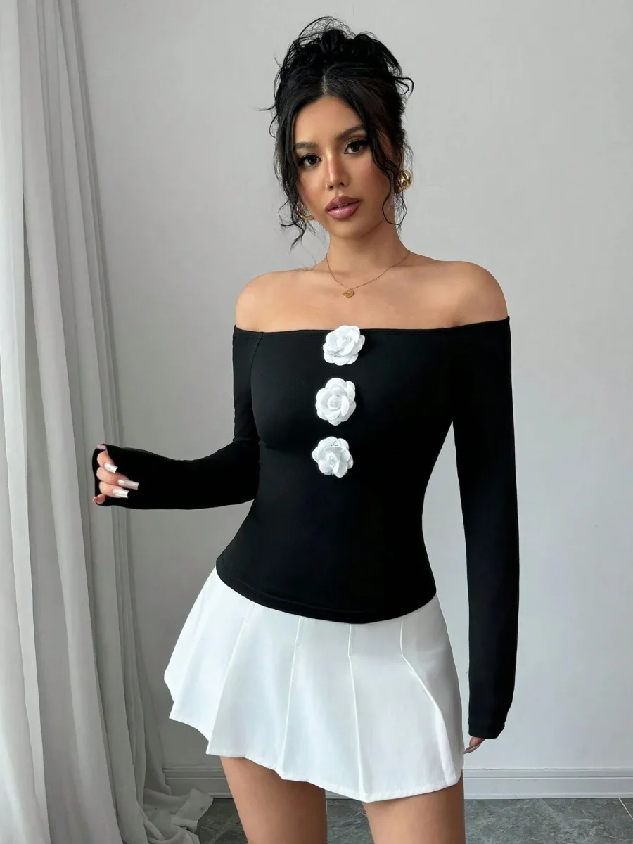 Floralia™ – Top 3D Floral Off‑Shoulder à Manches Longues
