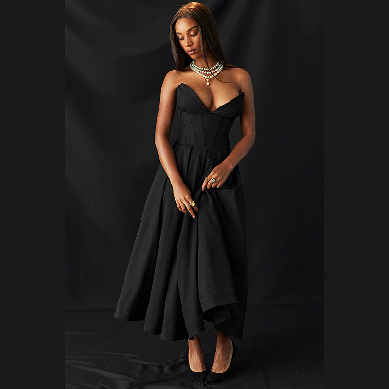 Sa longueur midi apporte un équilibre parfait entre glamour et élégance, tandis que son coloris noir profond en fait un classique intemporel, facile à accessoiriser selon l’occasion.