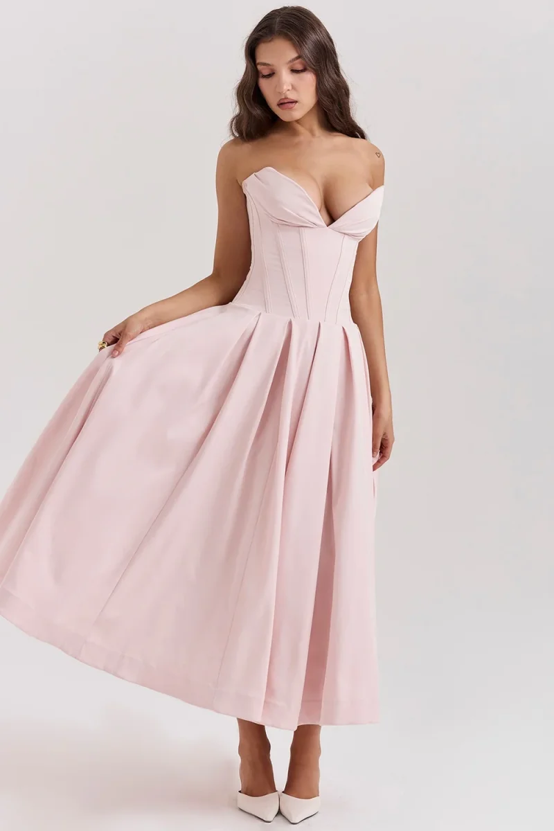 Son bustier sans bretelles dégage gracieusement les épaules et le cou, créant un port de tête élancé et raffiné. Le laçage au dos, inspiré des corsets traditionnels, ajoute une touche sensuelle maîtrisée, tout en soulignant la taille avec subtilité.