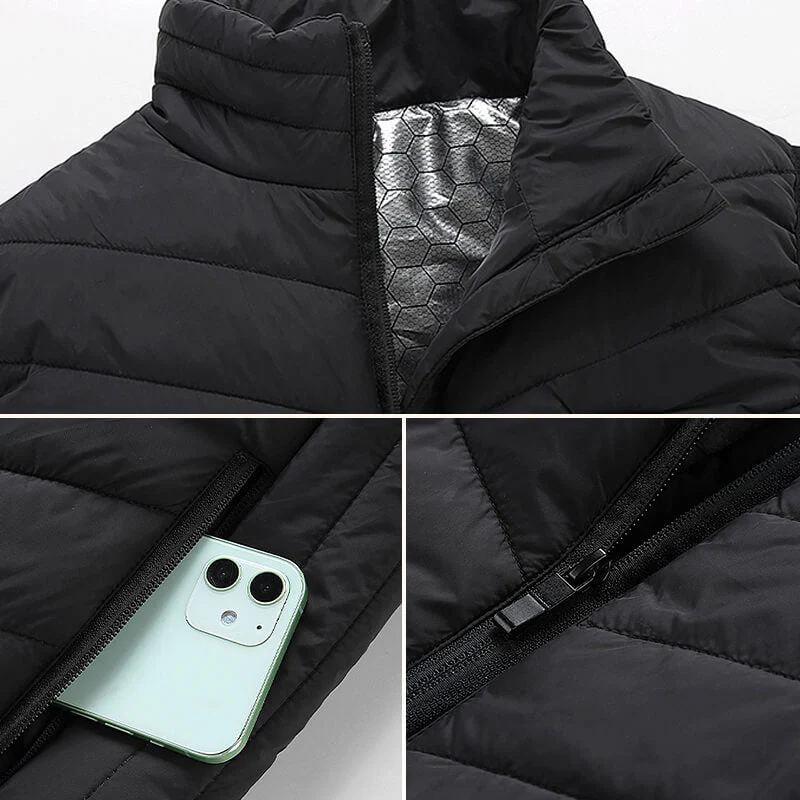 Ce gilet chauffant intelligent peut être porté comme vêtement d’extérieur avec un sweat-shirt/sweat à capuche, etc. Il convient également aux sous-vêtements chauds tels que les imperméables/manteaux de neige en hiver. des vêtements élégants pour tous les jours en hiver ! Coton rembourré intégré de haute qualité, la chaleur est répartie plus uniformément, meilleure rétention de la chaleur. + Surface imperméable / Col haut coupe-vent / Fermeture éclair en métal renforcée avec plus de durabilité et de douceur, plus de soucis de casse !