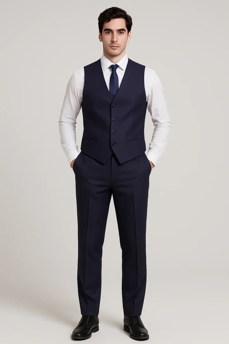 Ce costume trois pièces SlimFit bleu nuit est le parfait équilibre entre classe, modernité et aisance.
