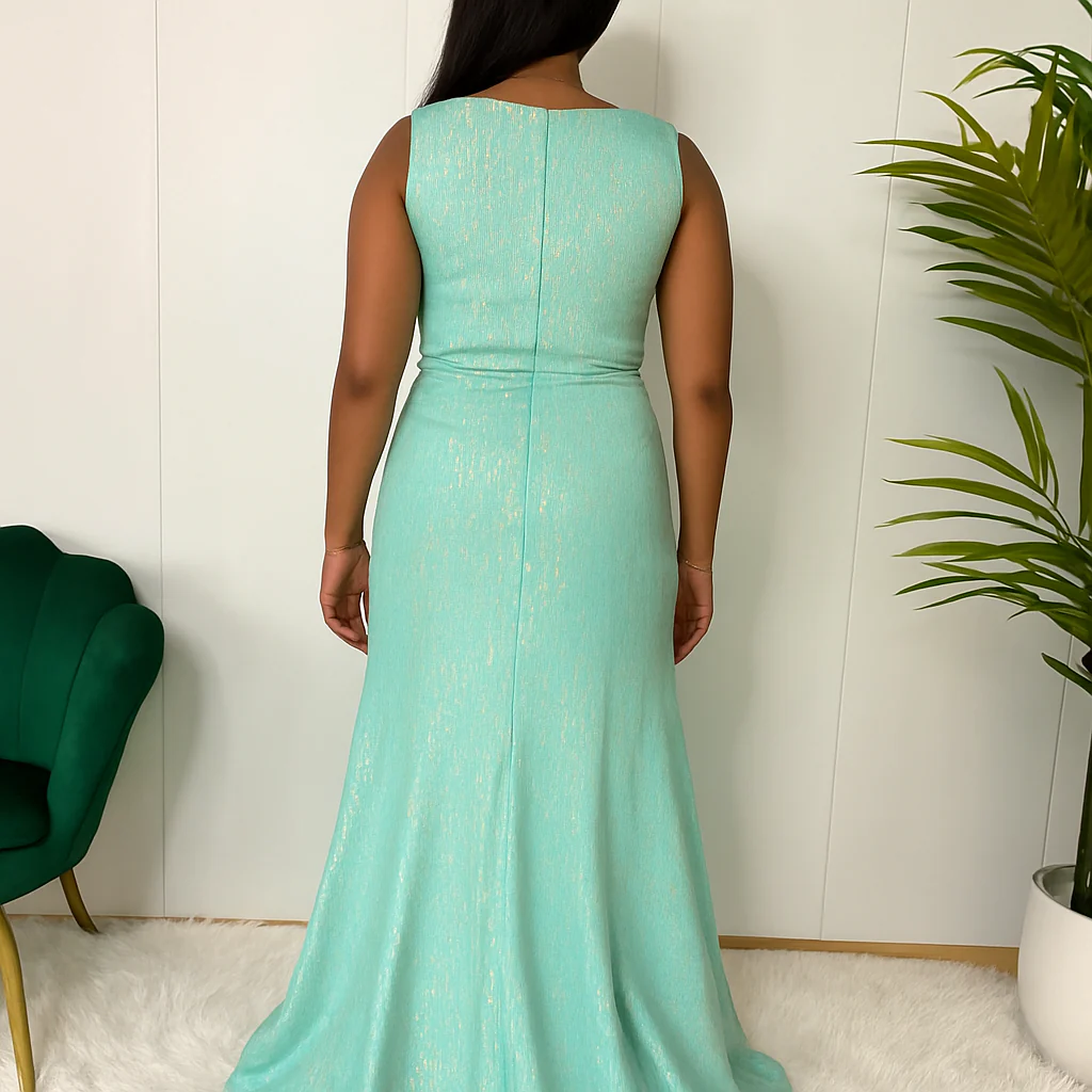 Sublime et raffinée, cette robe de soirée sirène turquoise et dorée est une véritable œuvre d’élégance. Sa coupe ajustée met parfaitement en valeur la silhouette, tandis que le tissu texturé aux reflets dorés capte la lumière avec délicatesse.