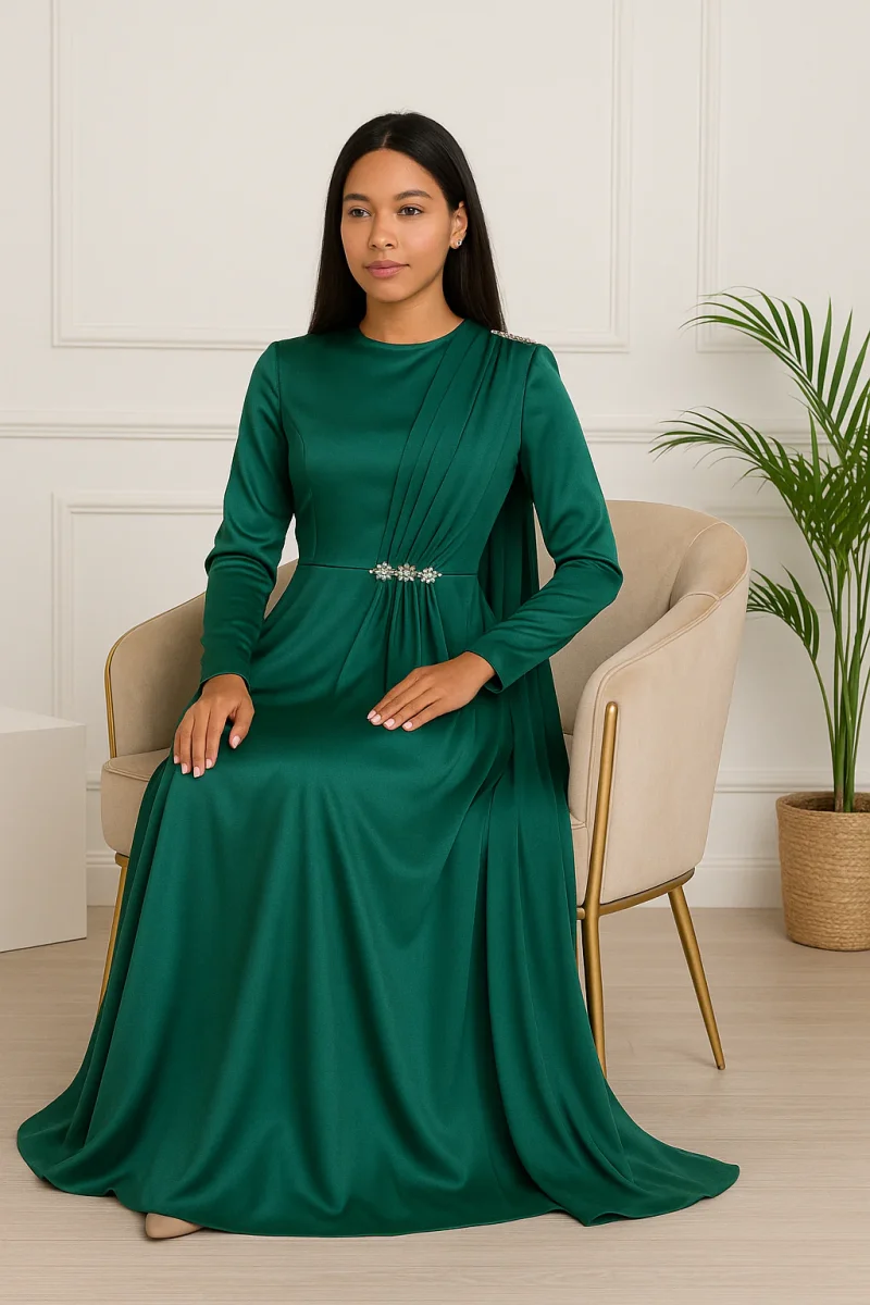 Hafsoit Mode – Robe longue satinée verte émeraude – Tenue de soirée élégante femme – Manches longues – Décolleté strassé – Idéale pour femmes voilées