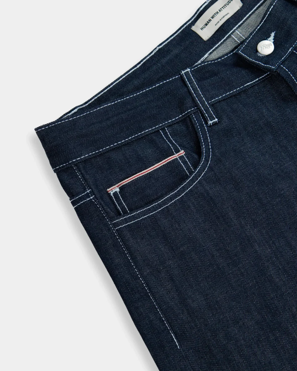 - Denim 12,5 oz, 100 % coton, sourcé et fabriqué au Portugal.