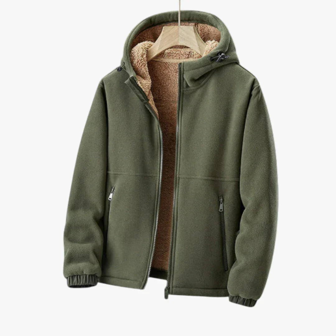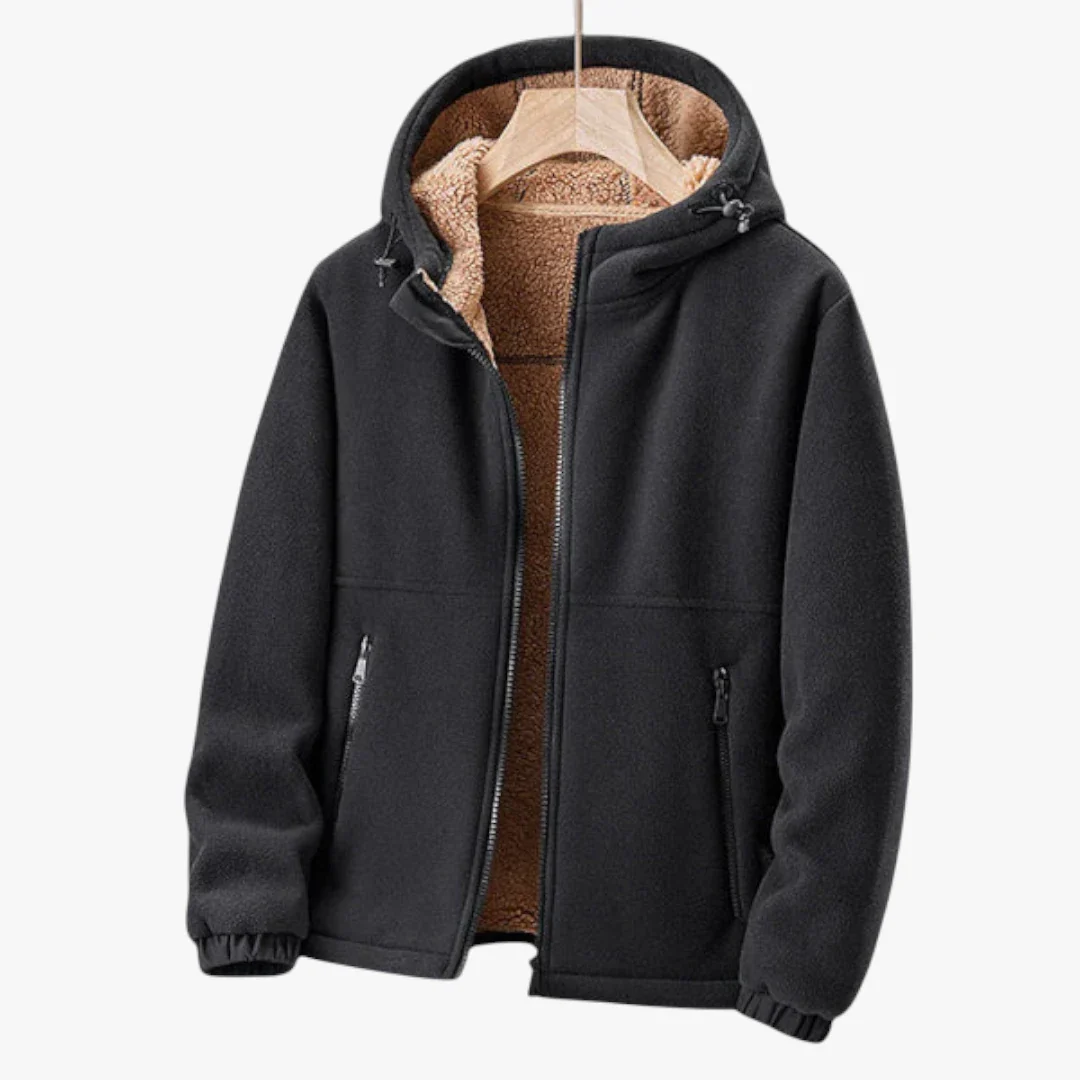 Veste polaire pour homme avec intérieur doublé en sherpa, capuche attenante et fermeture à glissière intégrale. Conçue pour une superposition décontractée, elle est dotée de poignets élastiques et de poches latérales pour une utilisation quotidienne.