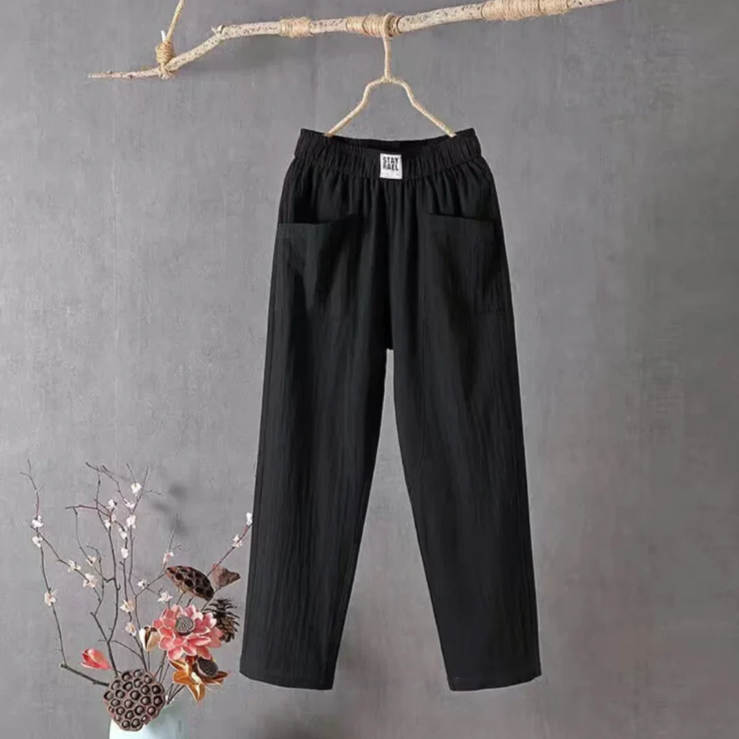 Ce pantalon ample pour femme est doté de deux poches latérales où vous pouvez facilement ranger vos articles essentiels et garder les mains libres – un mélange parfait de fonction et de style.