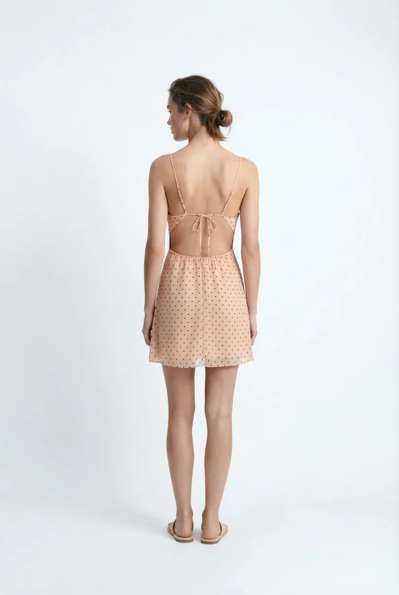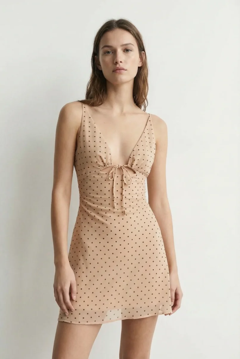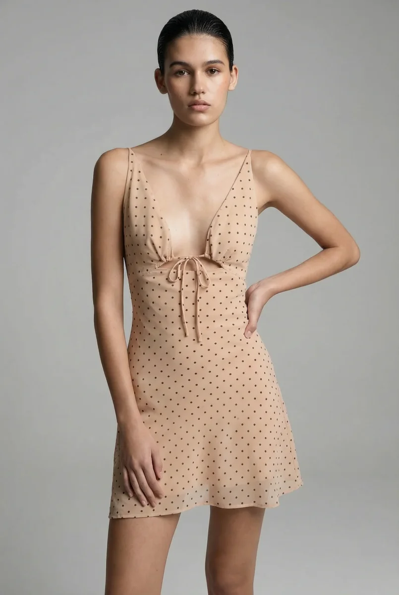 Son design frais est parfait pour les promenades estivales sur la plage ou les soirées entre amis. Avec son imprimé à pois délicat sur un fond beige, vous apportez une note vintage chic à votre garde-robe. Cette mini robe est conçue pour mettre en valeur votre silhouette, vous assurant ainsi d’être la star de chaque événement.