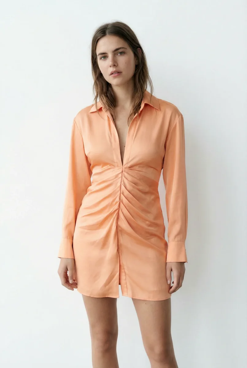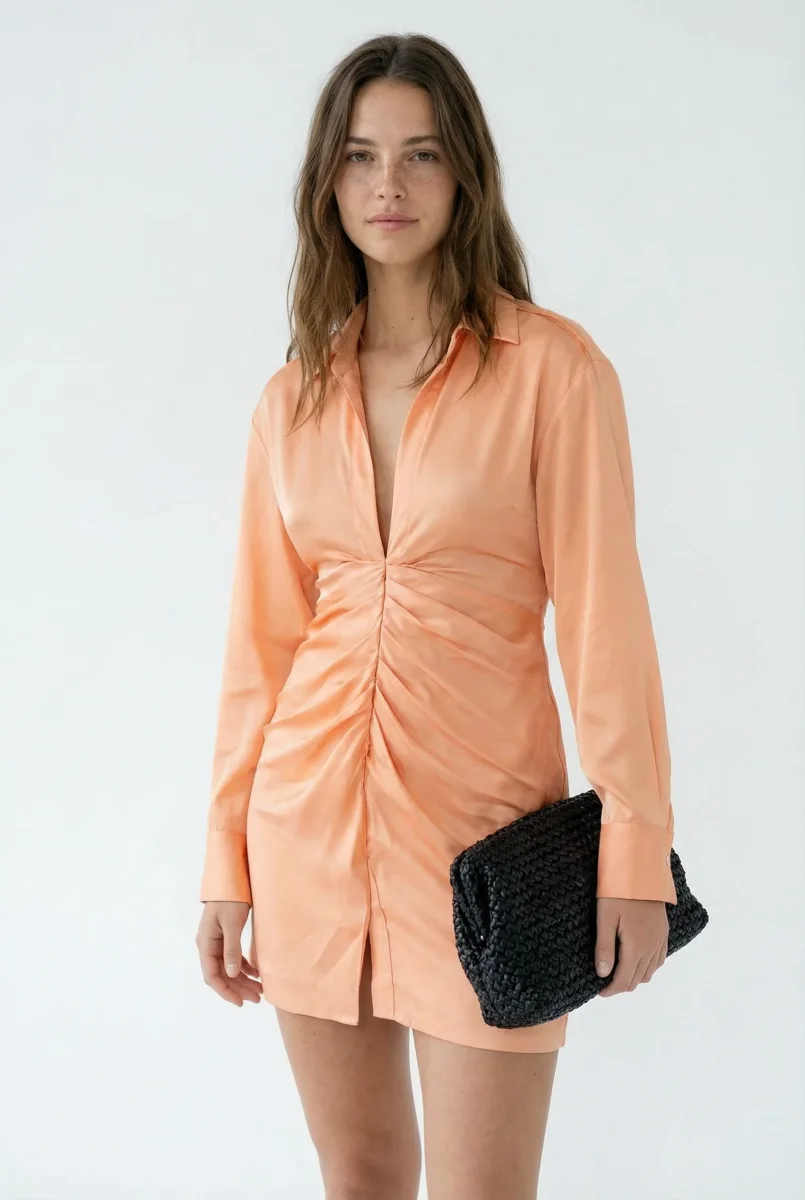 Éblouissez lors de vos prochaines soirées avec notre mini robe de soirée satinée orange pêche. Sa texture fluide et brillante attire tous les regards, faisant de cette pièce un incontournable pour celles qui souhaitent se démarquer. Avec sa coupe chemise à manches longues et son décolleté plongeant, cette robe allie confort et séduction, parfaite pour un dîner chic ou une soirée cocktail.