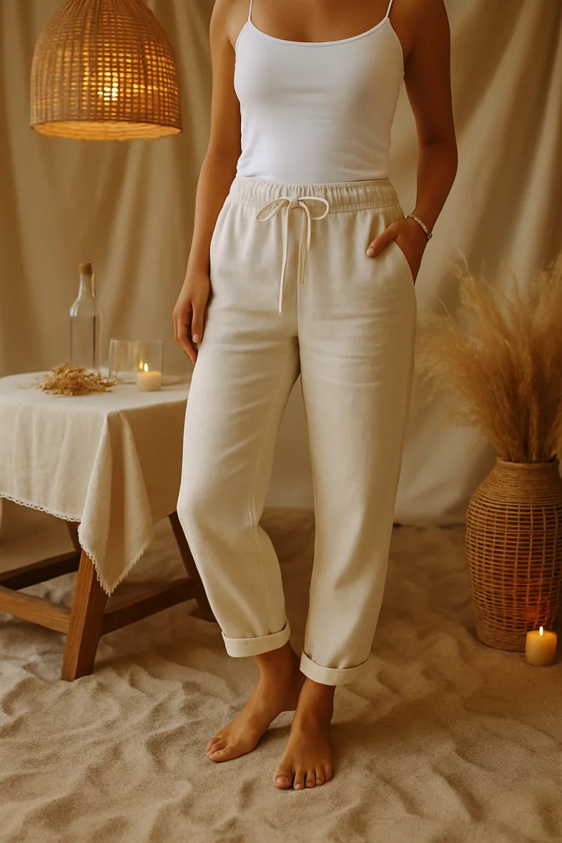 ✔️ Confort ultime – Grâce au mélange de coton et de lin de haute qualité, notre pantalon Monica offre un confort de port inégalé qui vous accompagne tout au long de la journée.