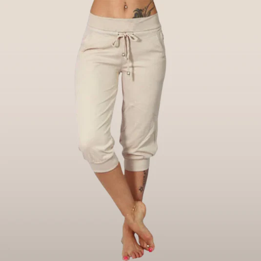 Pantalon capri confortable avec taille élastiquée et cordon de serrage, idéal pour les journées décontractées à la maison ou les activités de plein air.