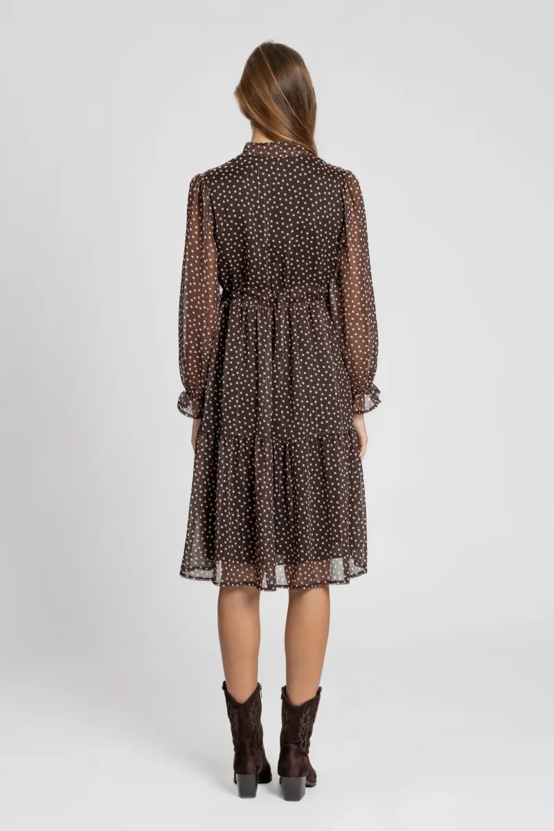 Une robe fluide marron à pois, polyvalente jour et soirée