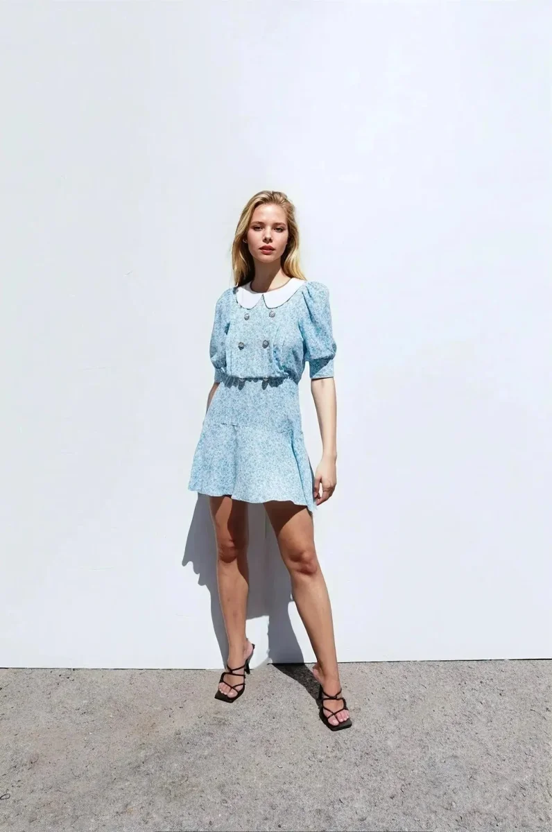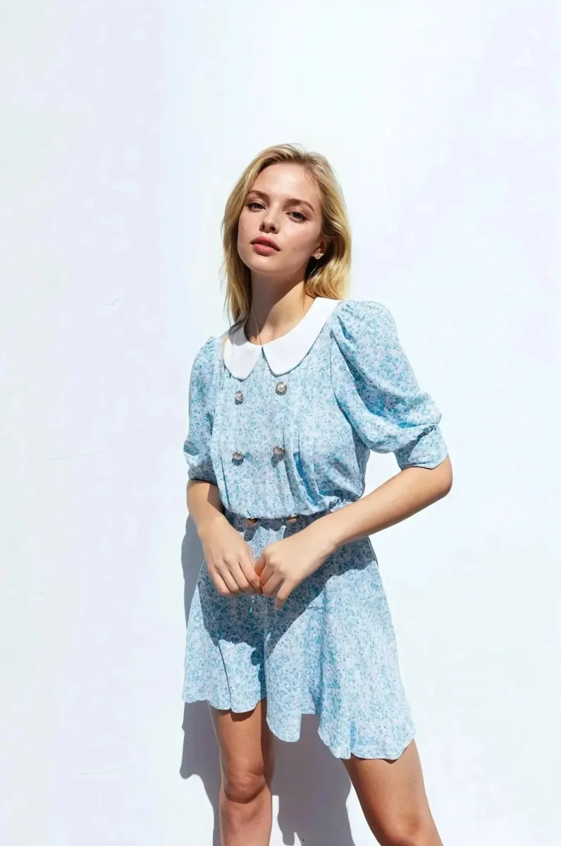 Robe Année 60 Imprimée Florale Col Unique Bleu Ciel Pour Un Style Élégant Et Confortable