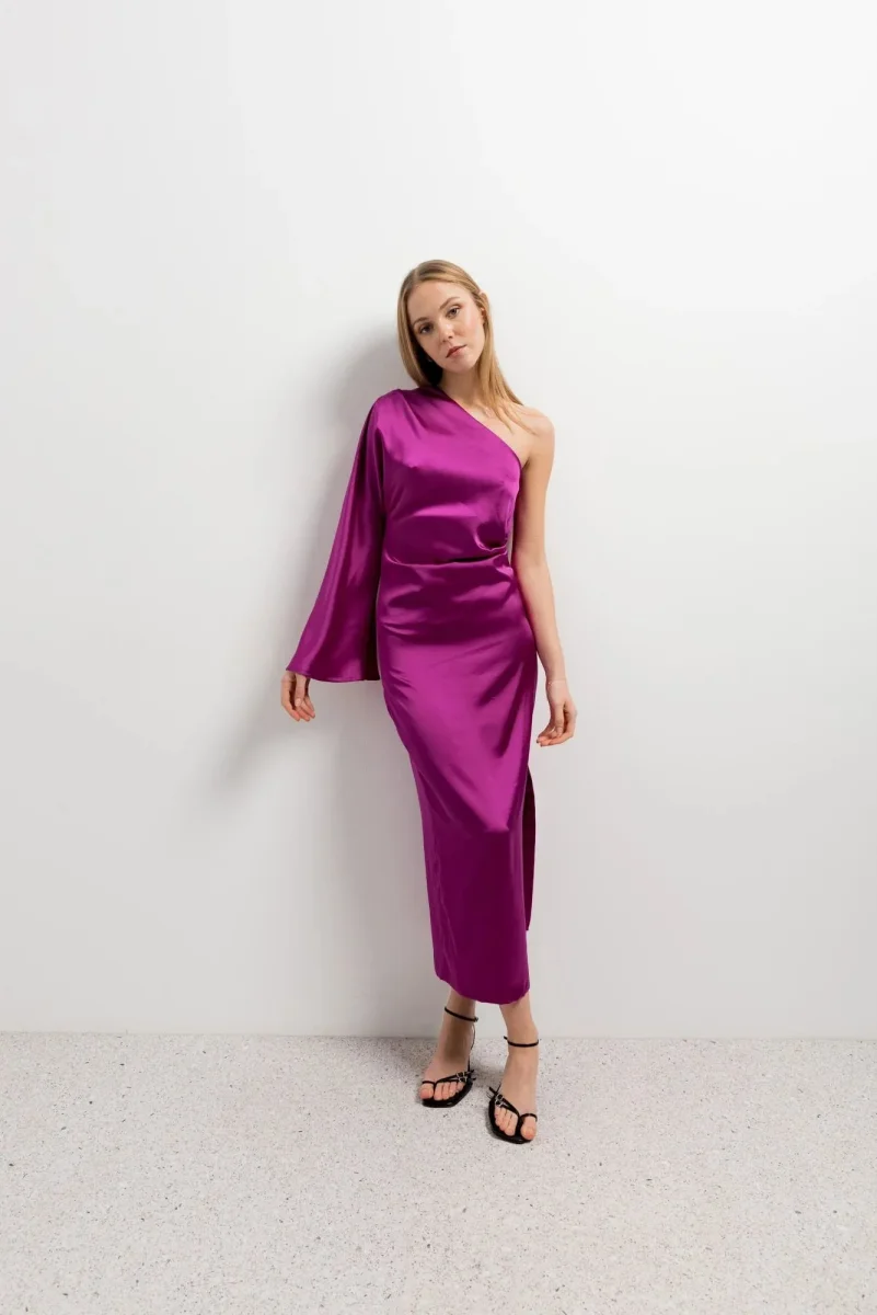 Éblouissez sur tous vos événements avec notre robe asymétrique de soirée en satin rose fuchsia. Cette pièce emblématique allie style moderne et élégance intemporelle, parfaites pour faire tourner les têtes lors de mariages, cocktails, ou soirées chics. Avec sa coupe unique à une épaule, vous êtes assurée de vous démarquer avec fraîcheur et raffinement.