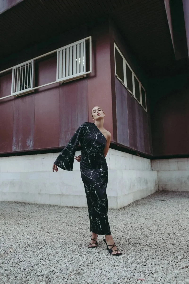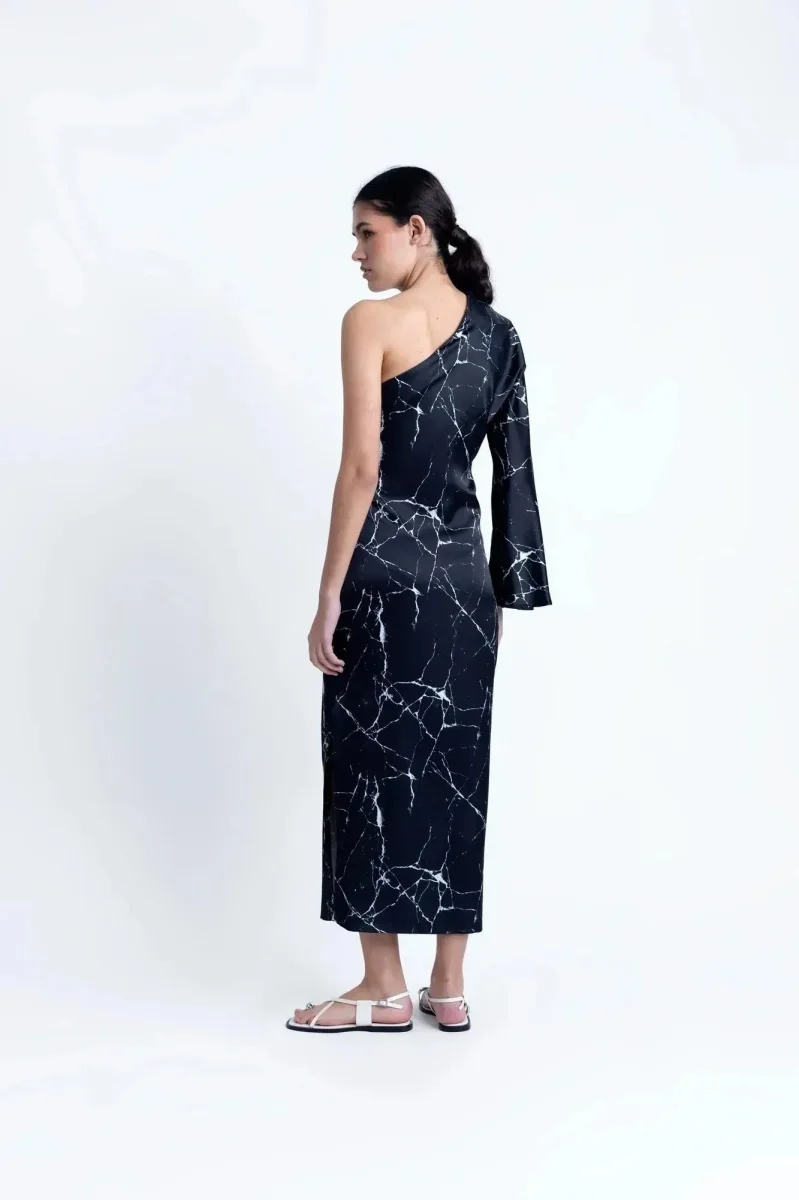 Découvrez la Robe de Soirée Femme Asymétrique en Satin Imprimé Marbre