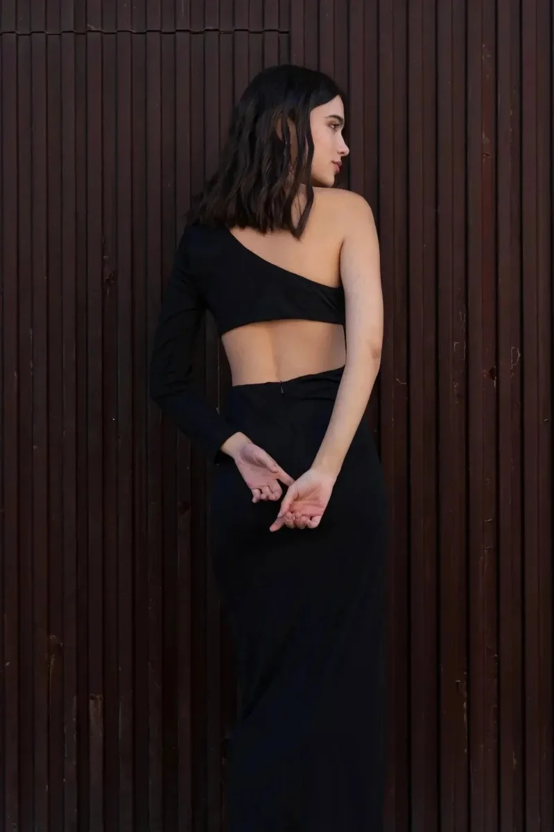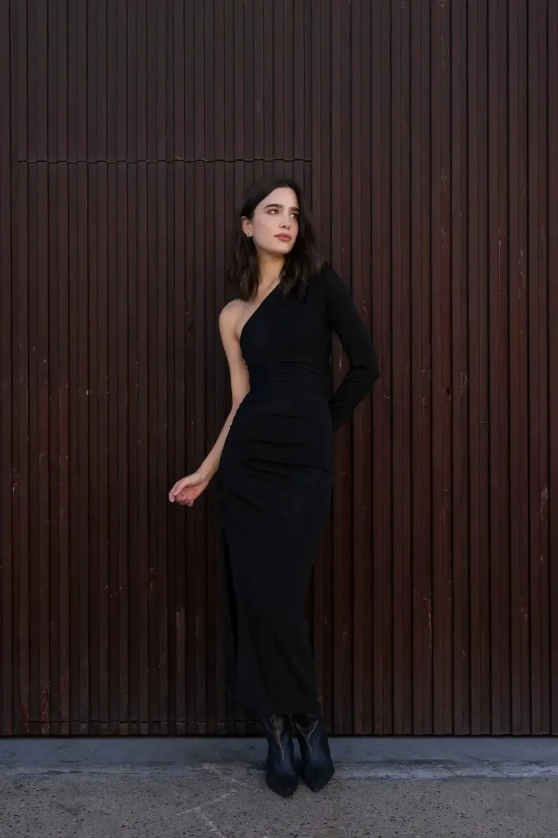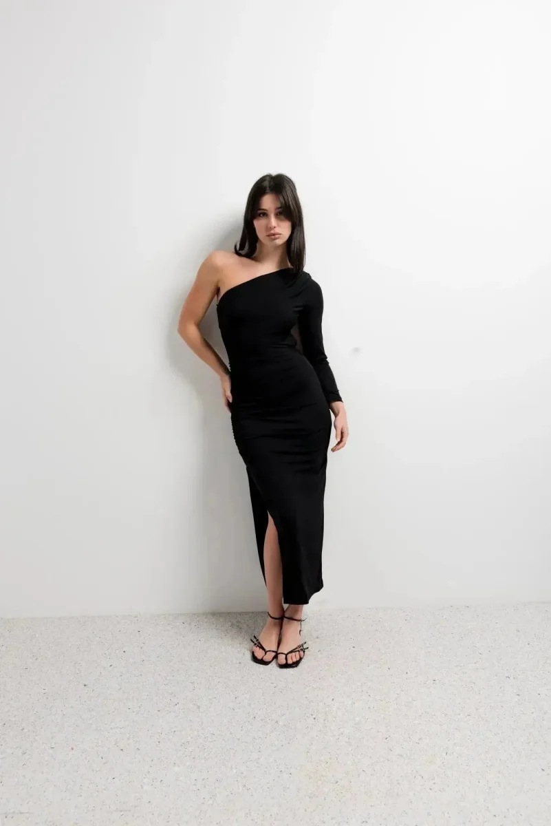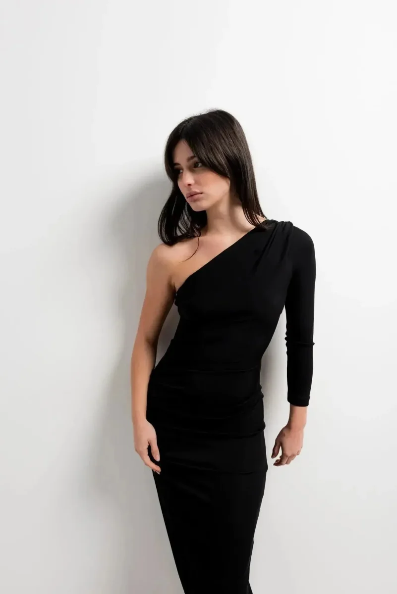 La robe asymétrique une manche est disponible en plusieurs couleurs, dont le noir classique et un bordeaux profond, qui s’associent facilement avec divers accessoires. Elle est proposée dans les tailles S, M et L, garantissant un ajustement parfait pour différentes morphologies.
