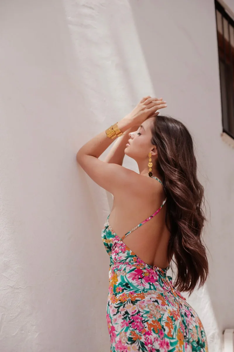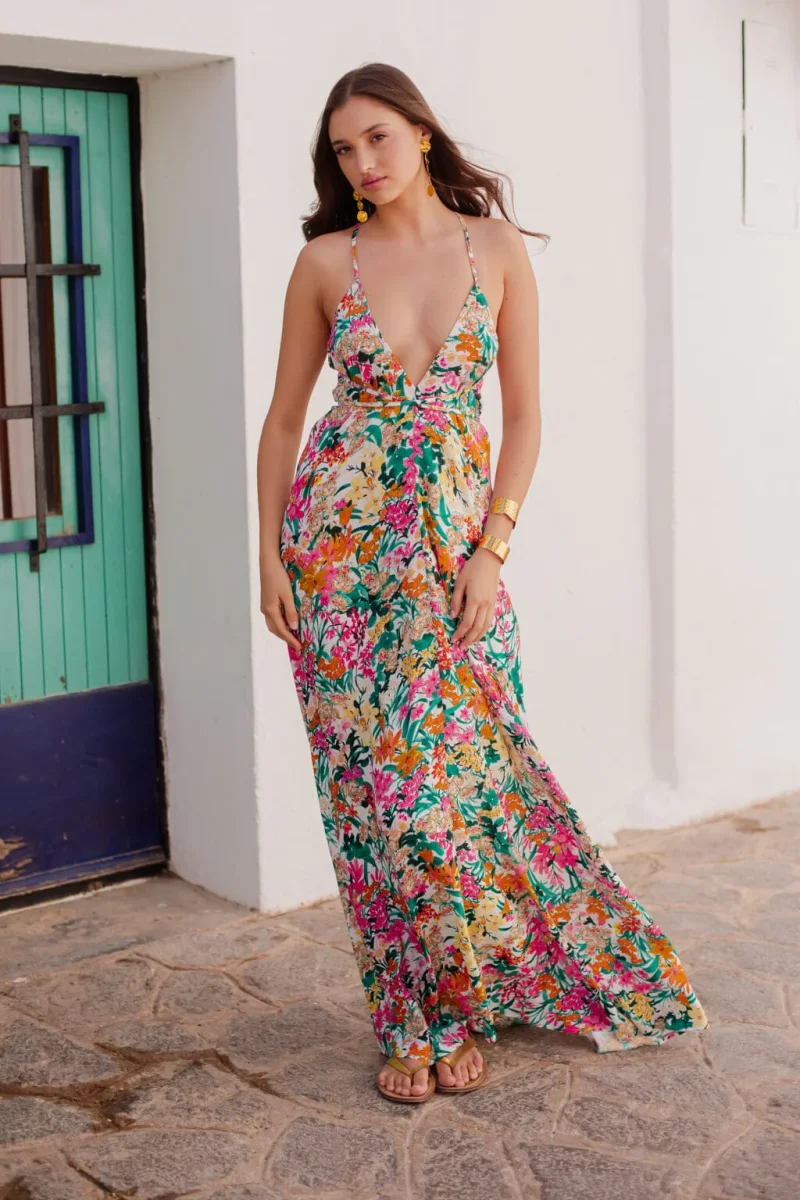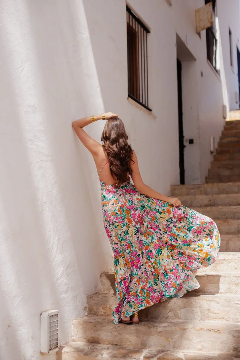 Laissez-vous séduire par la fraîcheur et l’élégance de notre robe longue à motif fleuri. Cette pièce exceptionnelle, ornée de délicates fleurs sur un fond blanc pur, offre un col en V qui met en valeur le décolleté. Polyvalente, elle se noue selon vos envies dans le cou ou autour de la taille, pour un ajustement personnalisé. Le dos nu audacieux ajoute une touche de séduction à cette silhouette fluide, parfaite pour les journées ensoleillées ou les soirées d’été légères.