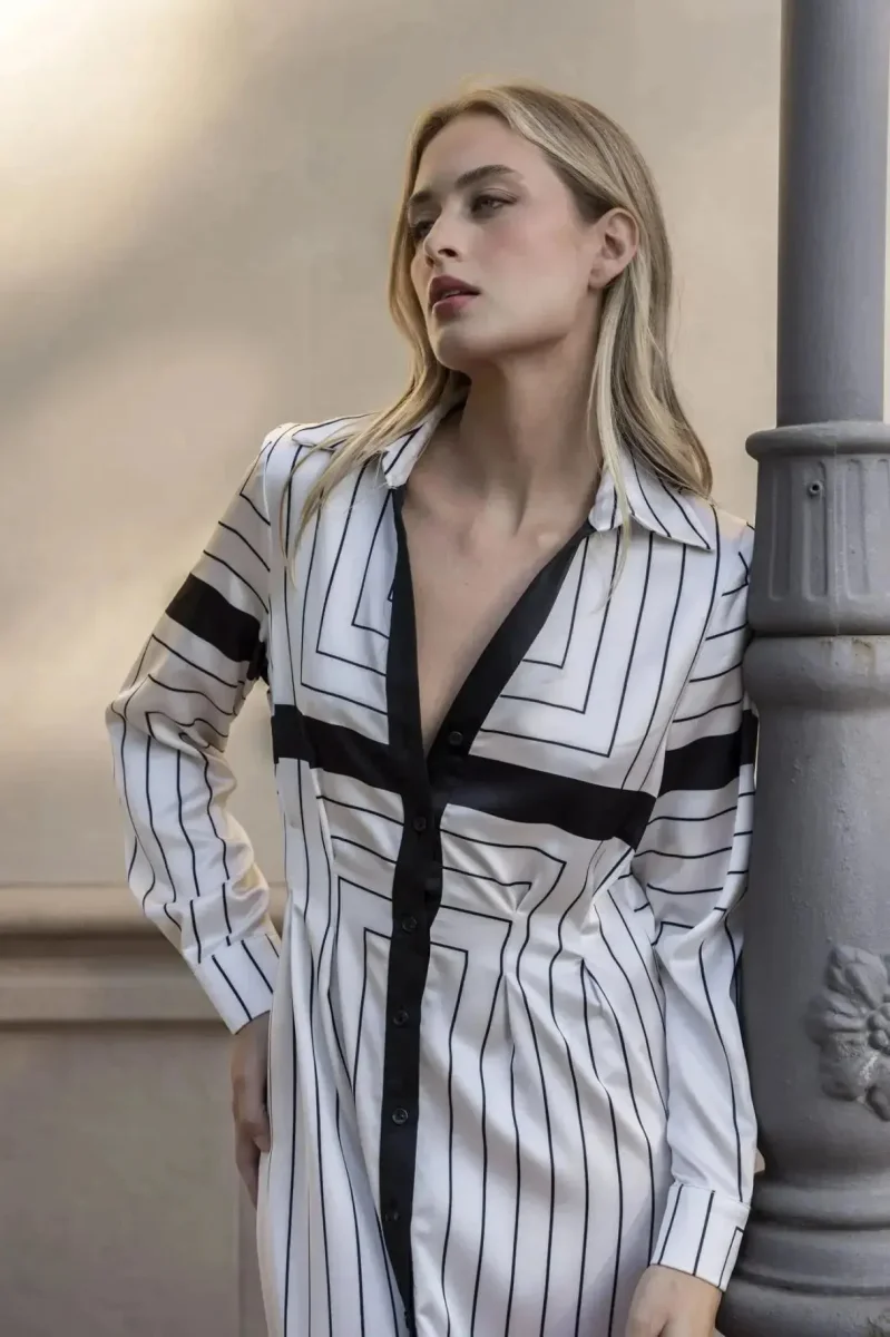 Apportez une touche d’élégance à votre garde-robe avec la robe chemise longue. Ce vêtement stylé et confortable est l’élément essentiel à posséder. Que ce soit pour le bureau, un brunch avec des amis ou une occasion spéciale, cette robe se révèle toujours appropriée. Les rayures noires et blanches ajoutent un attrait visuel qui capte le regard tout en restant sobre.