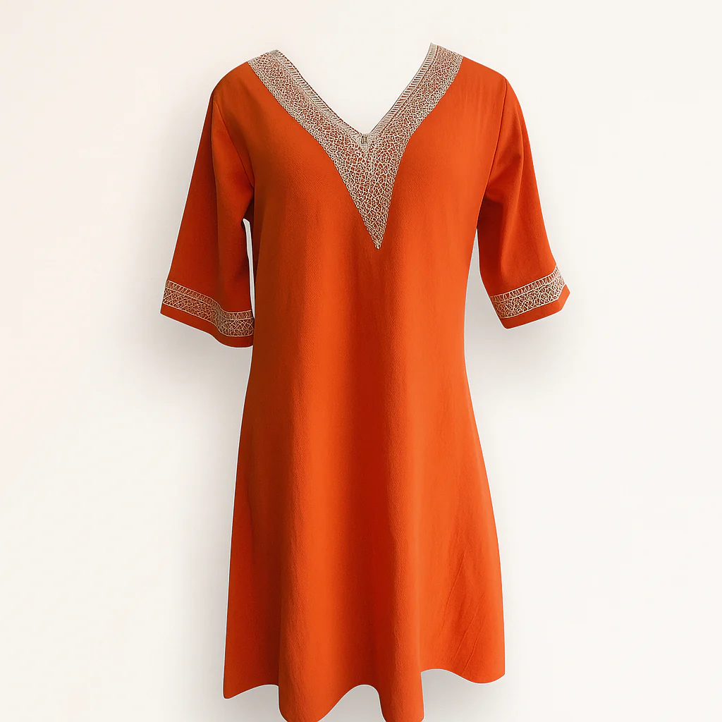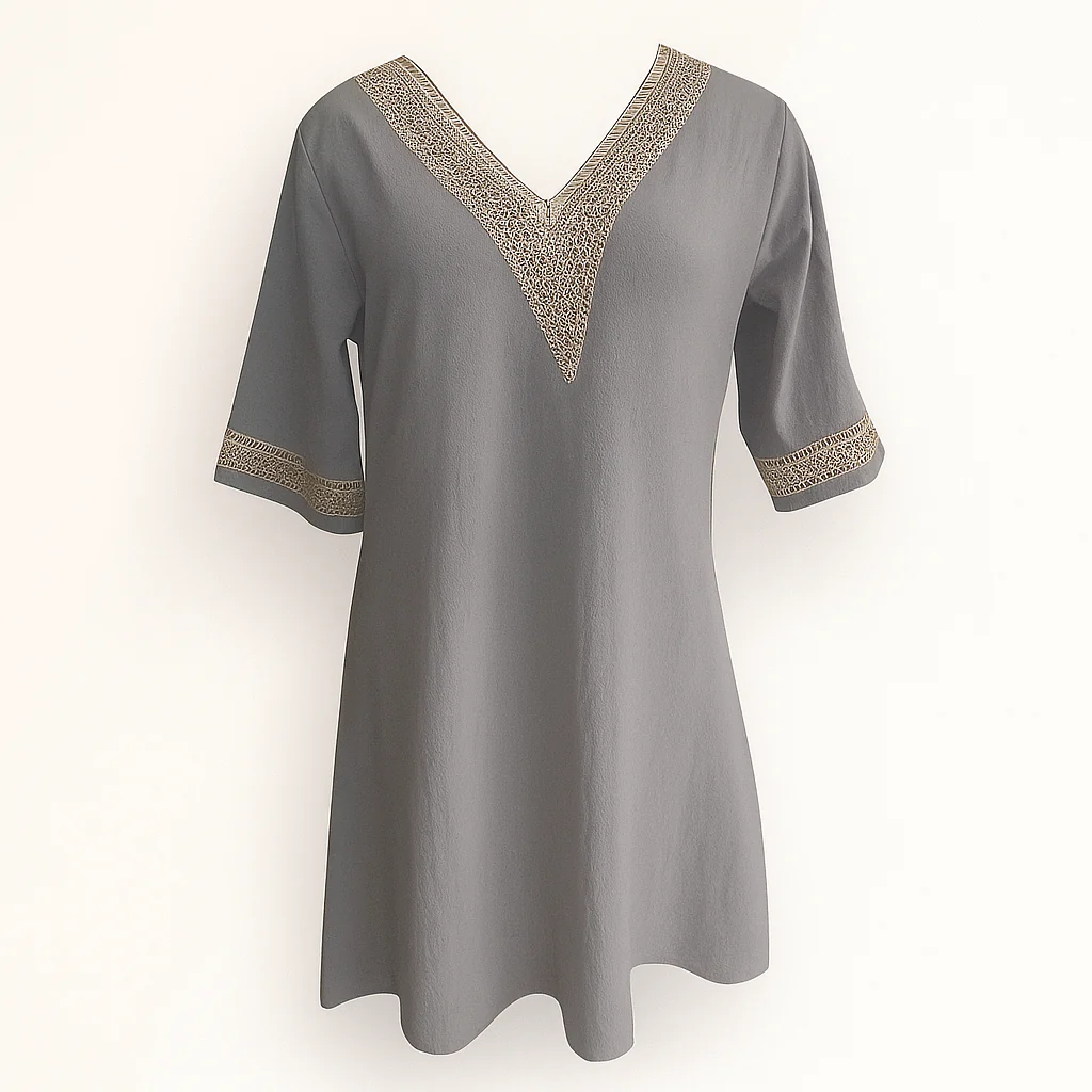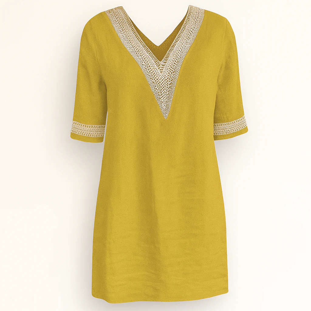 La robe décontractée pour femme, élégante et confortable sans effort – mélange de lin – col en V avec bordure en dentelle – coupe décontractée manches 3/4 est parfaite pour les sorties par temps chaud. Confectionnée dans un mélange de lin respirant, la robe présente un col en V flatteur avec une bordure en dentelle délicate et des manches trois-quarts. La coupe ample assure un confort tout au long de la journée et le rend idéal pour les loisirs.