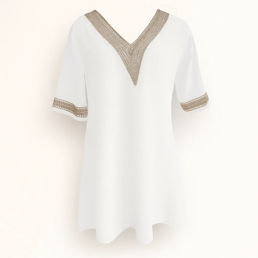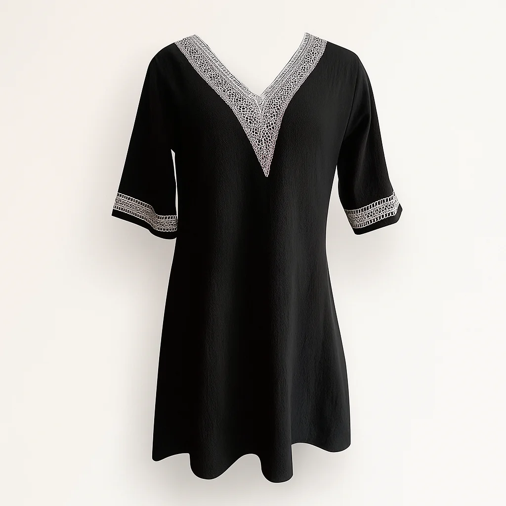 - Conception : col en V avec bordure en dentelle, manches trois-quarts