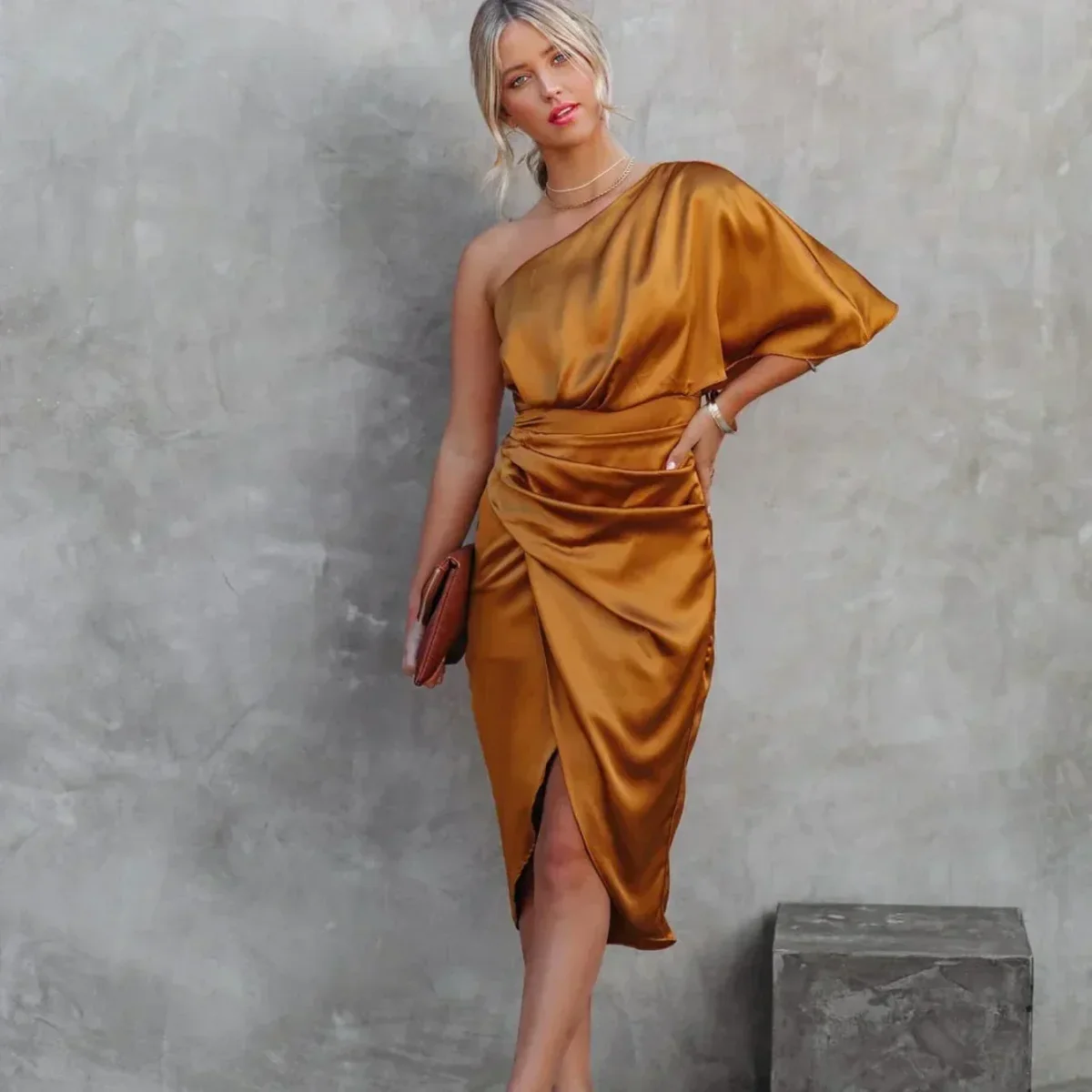 - Silhouette asymétrique : L’encolure asymétrique apporte une touche contemporaine et audacieuse, et confère à la robe une élégance moderne.