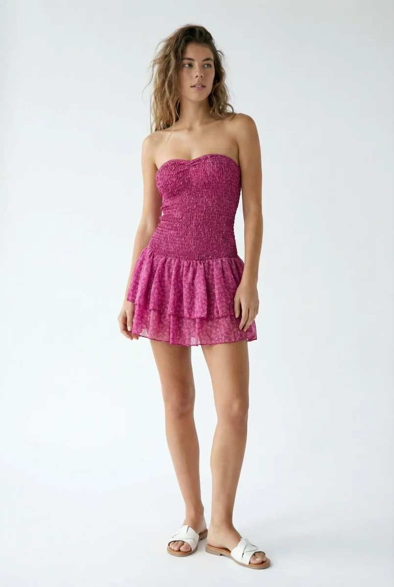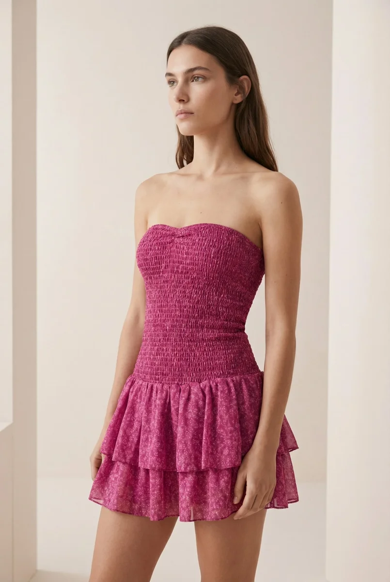 La coupe courte met en valeur la silhouette tout en offrant une grande liberté de mouvement. L’encolure cœur sublime le buste avec délicatesse, tandis que les épaules dénudées style Bardot apportent une féminité assumée, très recherchée dans les tendances actuelles de la mode adolescente.