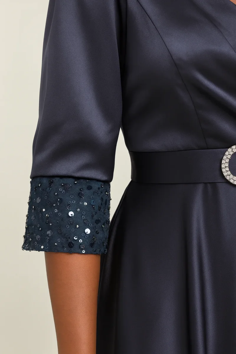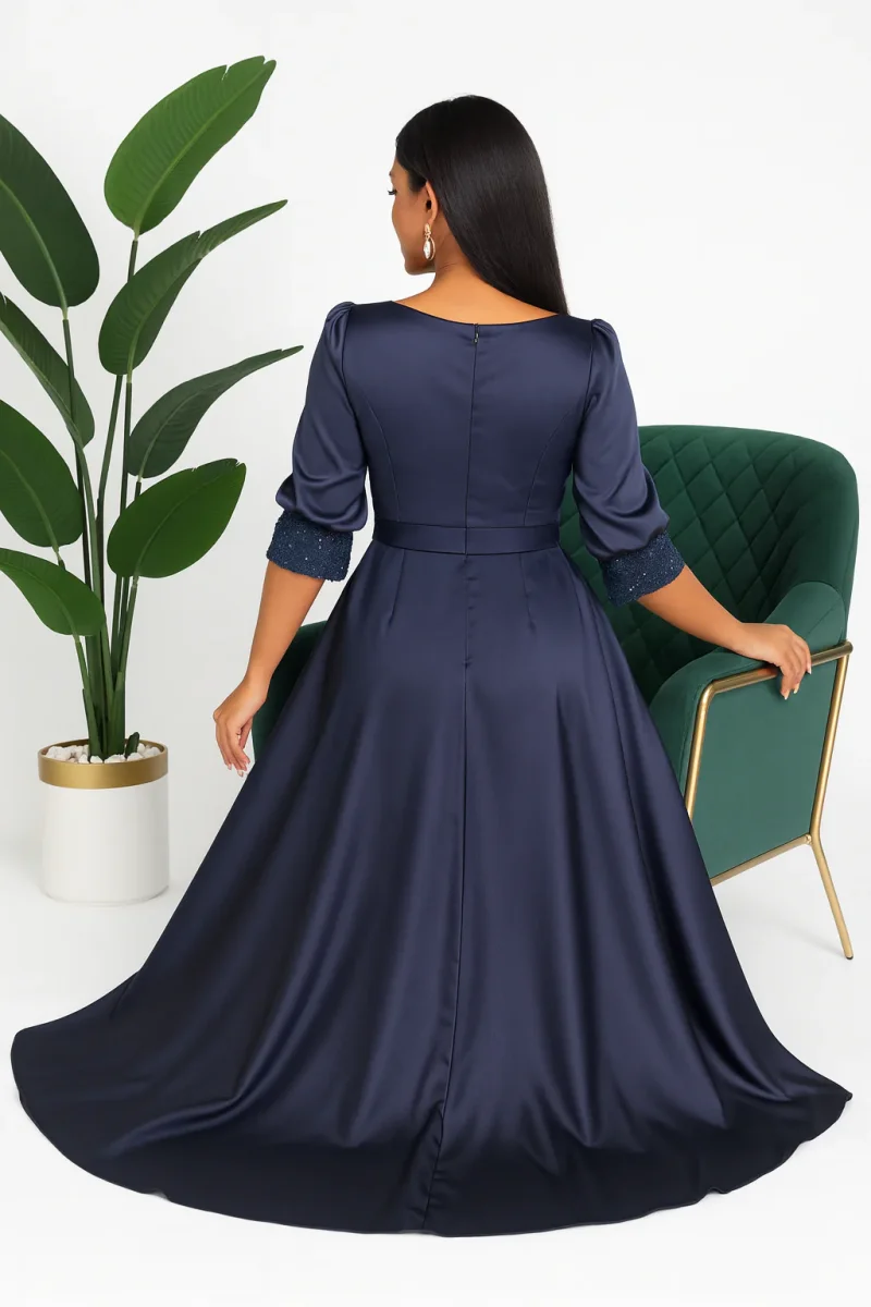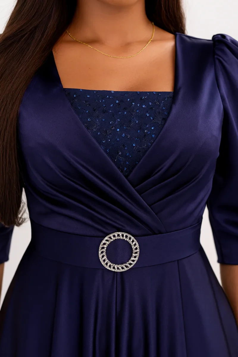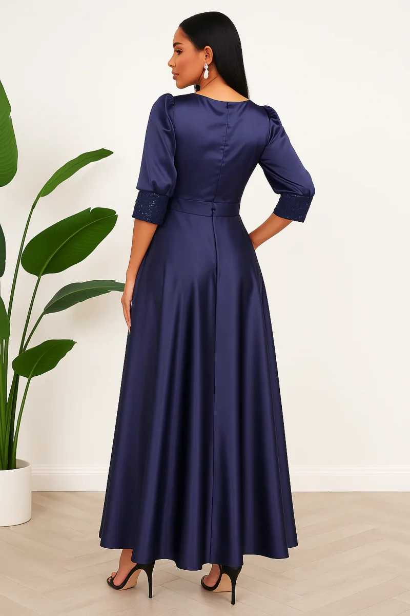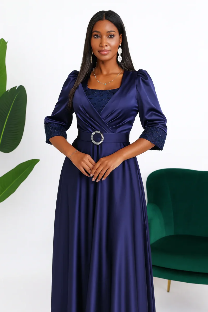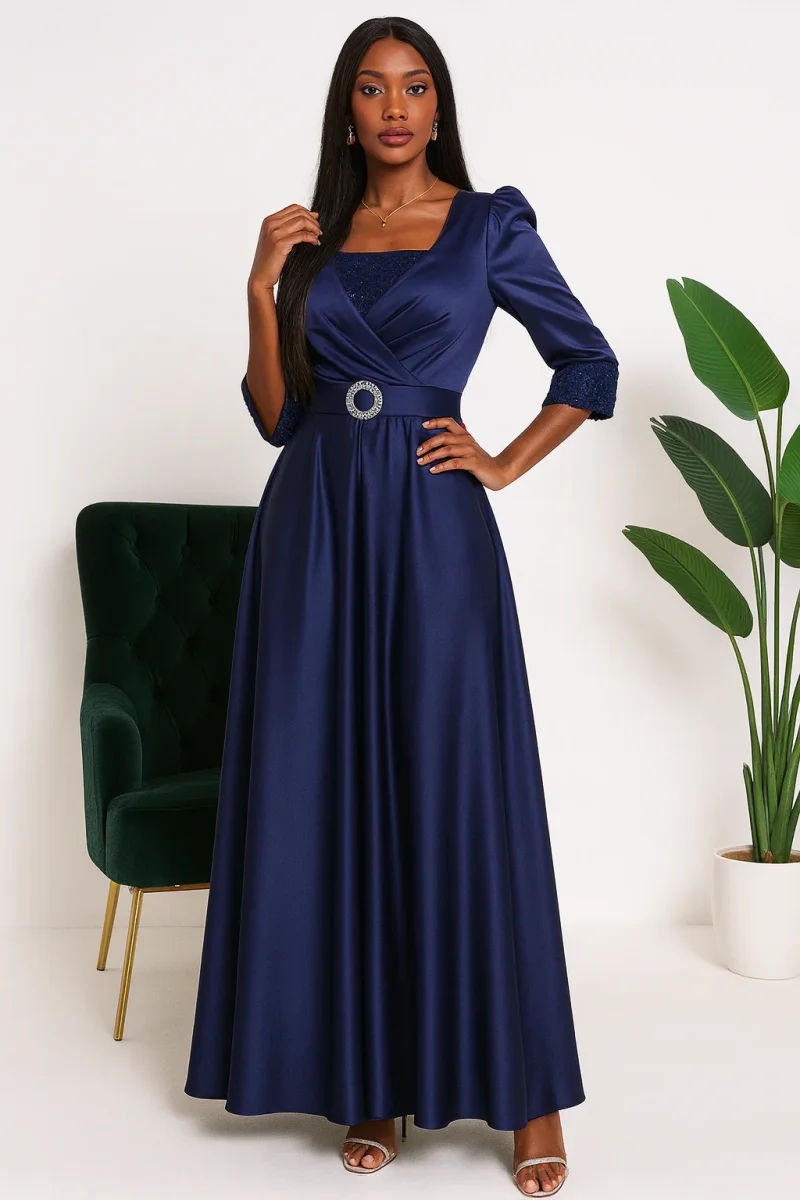 Robe de soirée longue bleu nuit en satin – Élégance chic avec manches mi-longues et ceinture bijou