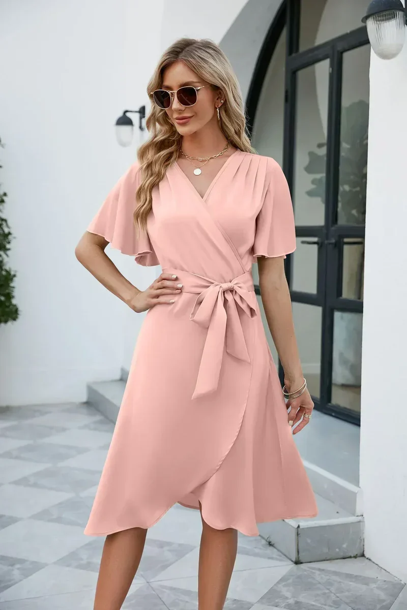 Élégante robe portefeuille pour femme, à manches courtes, avec une ceinture à nœud qui souligne la taille. Le tissu souple et le décolleté en V lui confèrent une allure féminine, idéale pour l’été, le travail ou les sorties nocturnes.