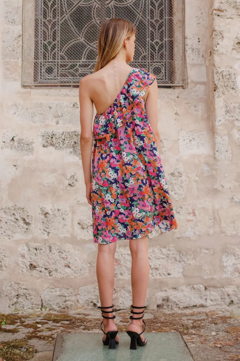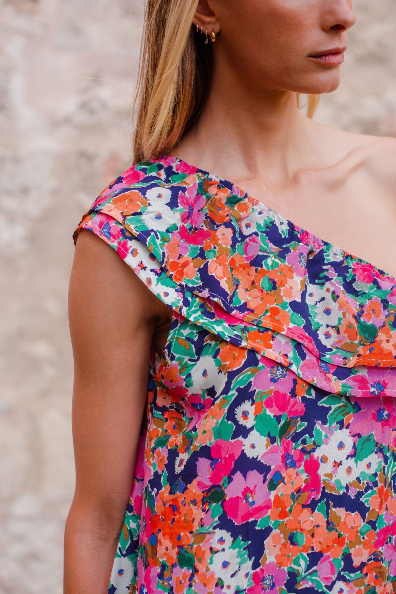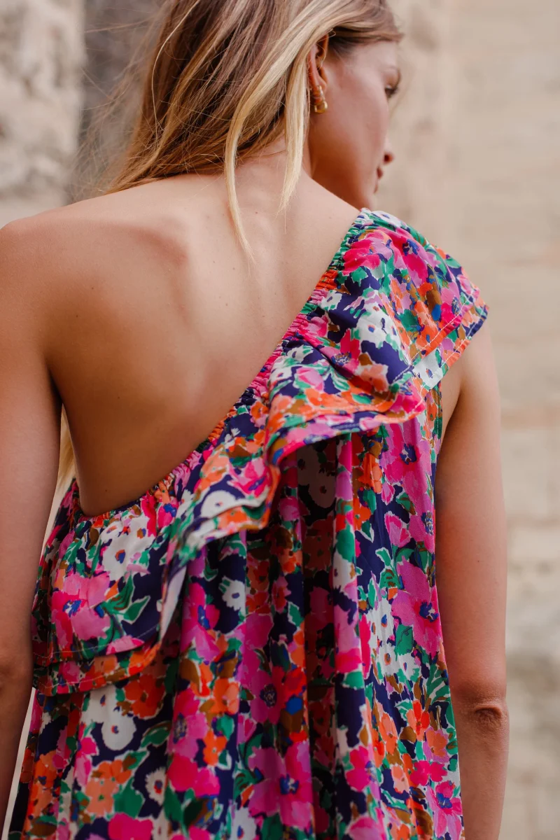 Faites sensation avec notre robe courte asymétrique, une pièce audacieuse qui allie légèreté et style. Son tissu léger vous offre une sensation de confort sans égal, tandis que son imprimé floral sur fond bleu marine évoque une explosion de couleurs vives et chatoyantes. Cette robe est conçue pour vous démarquer avec élégance lors de chaque occasion, vous permettant de rayonner de beauté et de charme. Optez pour cette robe courte aux motifs floraux captivants et laissez la magie des fleurs égayer votre garde-robe estivale.