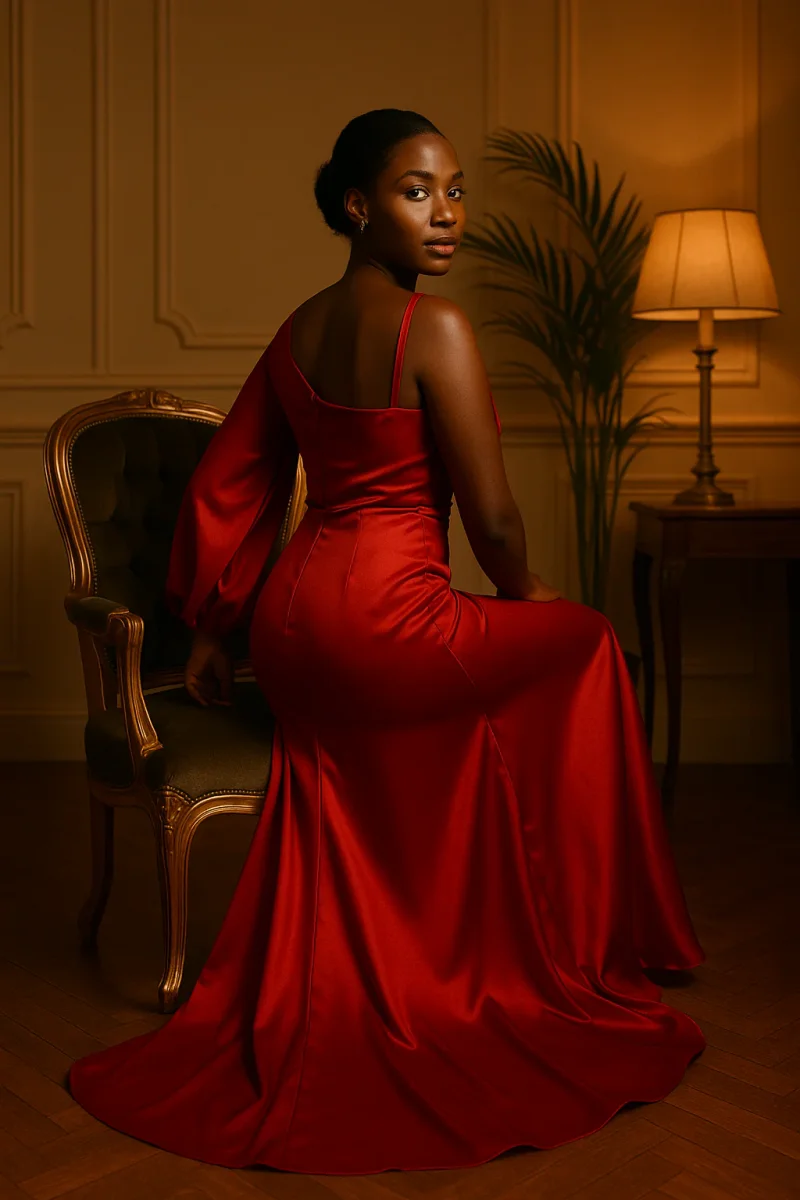 Cette robe longue satinée à une manche incarne l’élégance et la féminité. Sa coupe asymétrique met en valeur l’épaule avec un délicat motif en forme de rose, tandis que la manche ballon apporte un volume glamour. Le tissu satiné glisse sur la silhouette et la fente haute dévoile subtilement la jambe pour une allure sophistiquée. Disponible en rouge passion et en doré lumineux, elle s’adapte aussi bien aux cérémonies qu’aux soirées habillées.