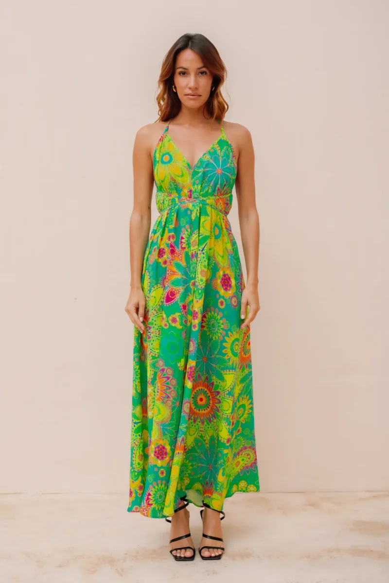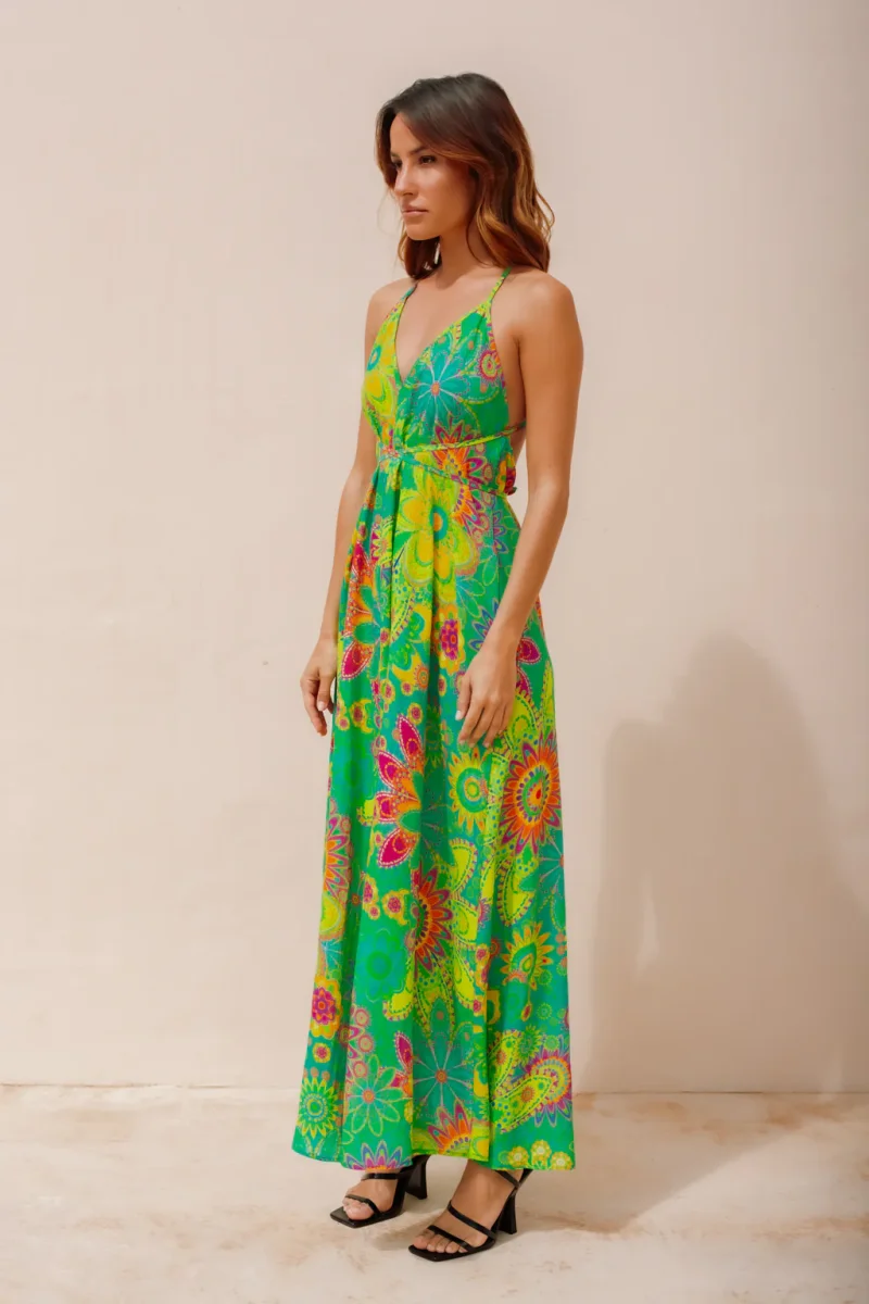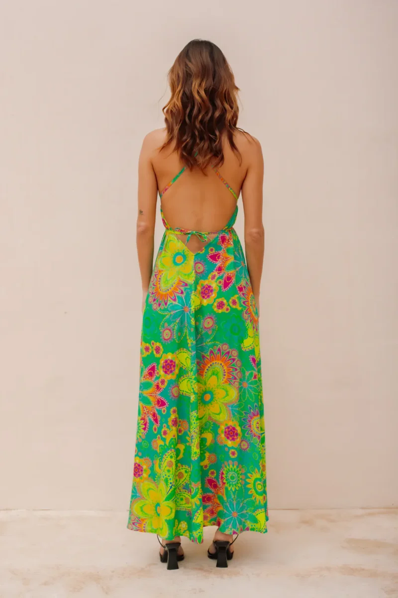 Avec son dos nu audacieux, cette robe vous offre une allure à la fois sensuelle et raffinée. Son motif fleuri aux tons violets froids et orangés ajoute une touche de féminité et de charme à votre tenue. Le décolleté en V met en valeur votre poitrine avec subtilité, créant ainsi un équilibre parfait entre élégance et séduction.