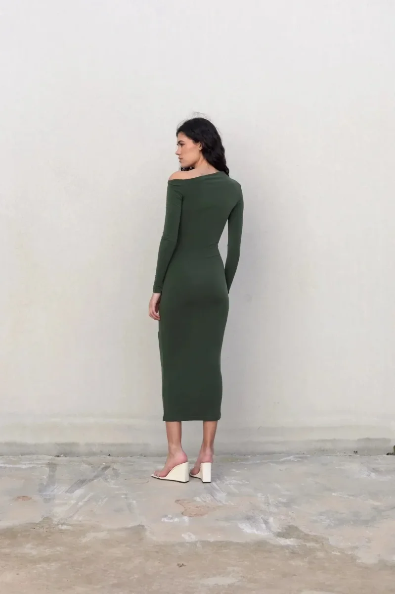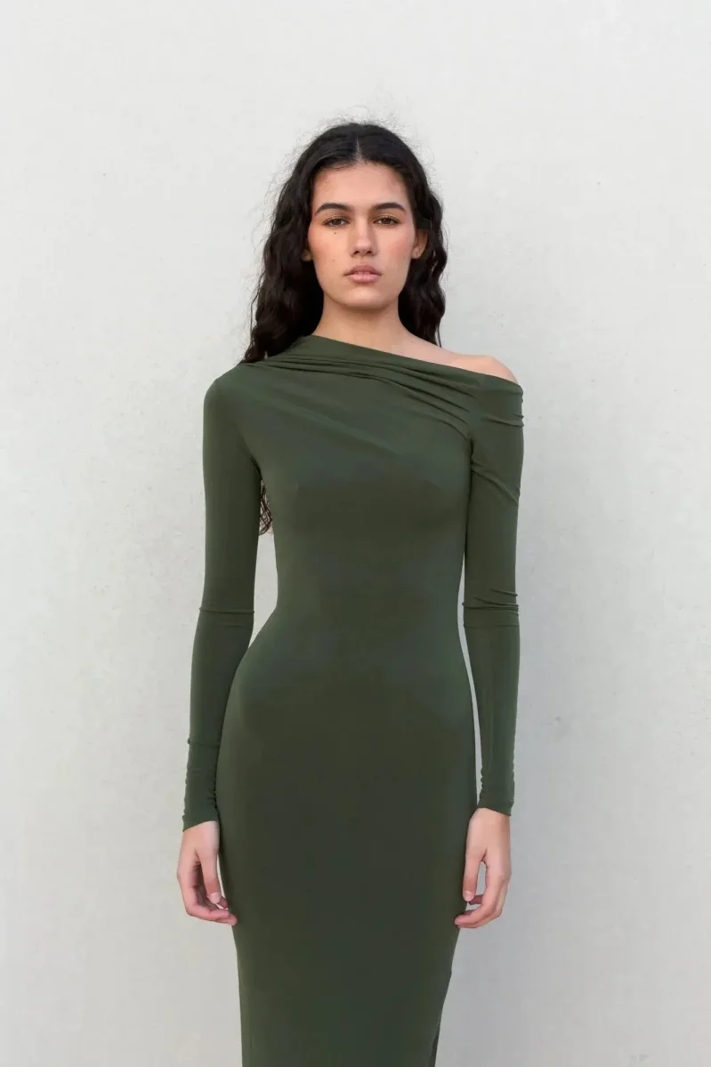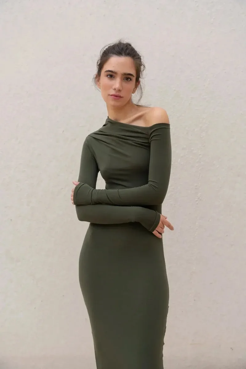 Découvrez notre magnifique robe moulante kaki, une pièce incontournable qui allie élégance et confort. Conçue pour mettre en valeur votre silhouette, cette robe arbore une coupe asymétrique audacieuse avec une épaule dénudée, créant un look à la fois chic et séduisant. Sa matière fluide et stretch épouse délicatement vos courbes, vous offrant un confort optimal tout en étant à la pointe de la mode.