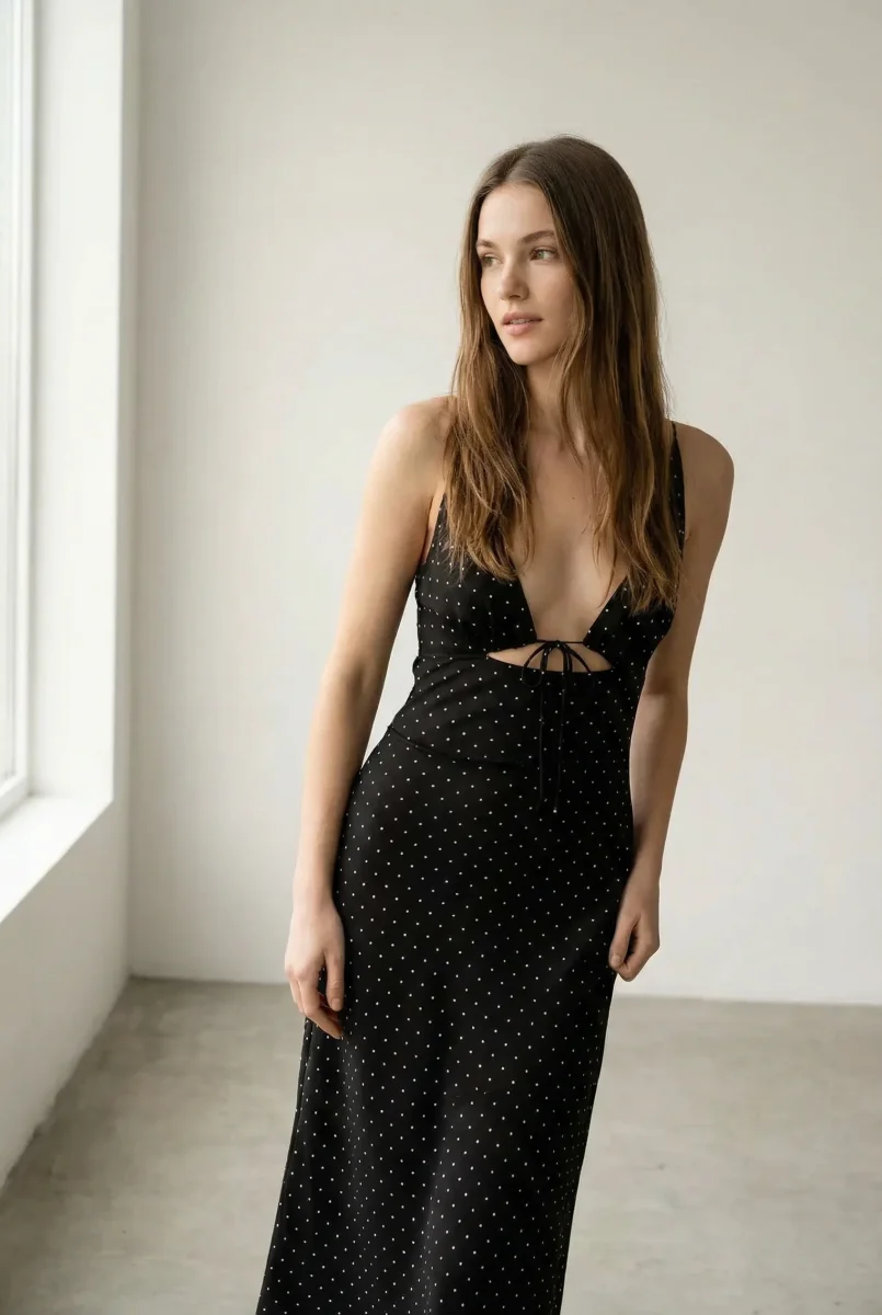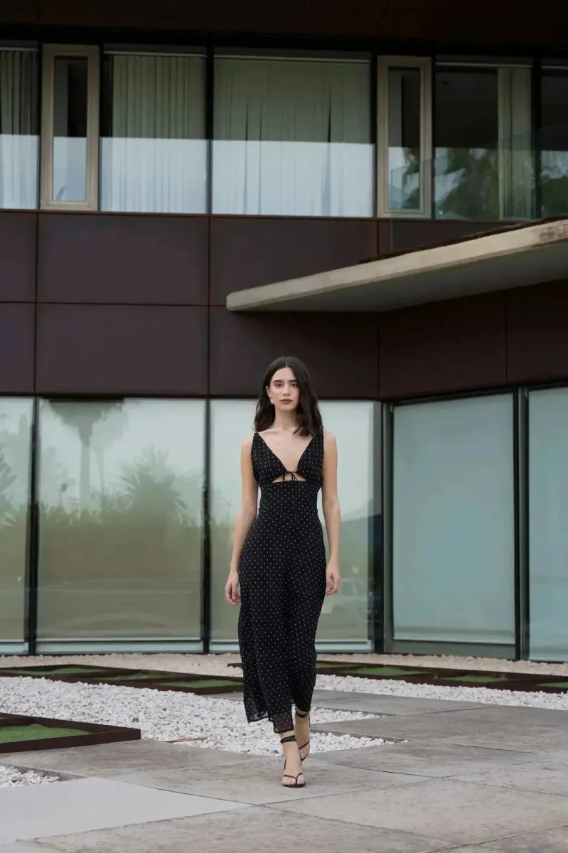Envie d’un look chic pour vos soirées d’été ? Ne cherchez pas plus loin ! La robe noire à pois blanc est la pièce parfaite pour mettre en valeur votre silhouette tout en restant à l’aise. Avec son design fluide et son dos nu audacieux, cette robe est idéale pour toutes les occasions estivales, des dîners entre amis aux soirées raffinées.
