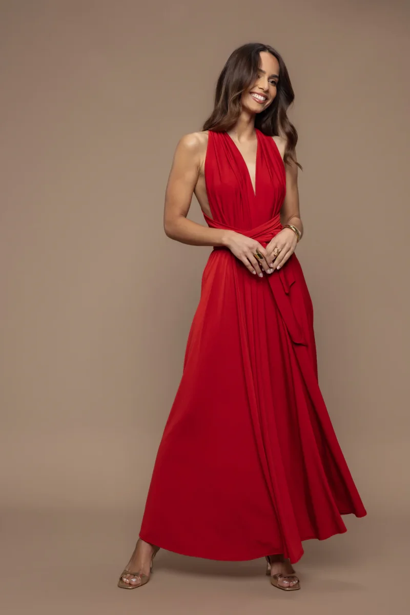 La robe Prestance incarne l’élégance et la polyvalence. Avec son haut multi-positions, cette pièce peut être nouée de multiples façons, vous permettant de créer une allure unique à chaque fois.