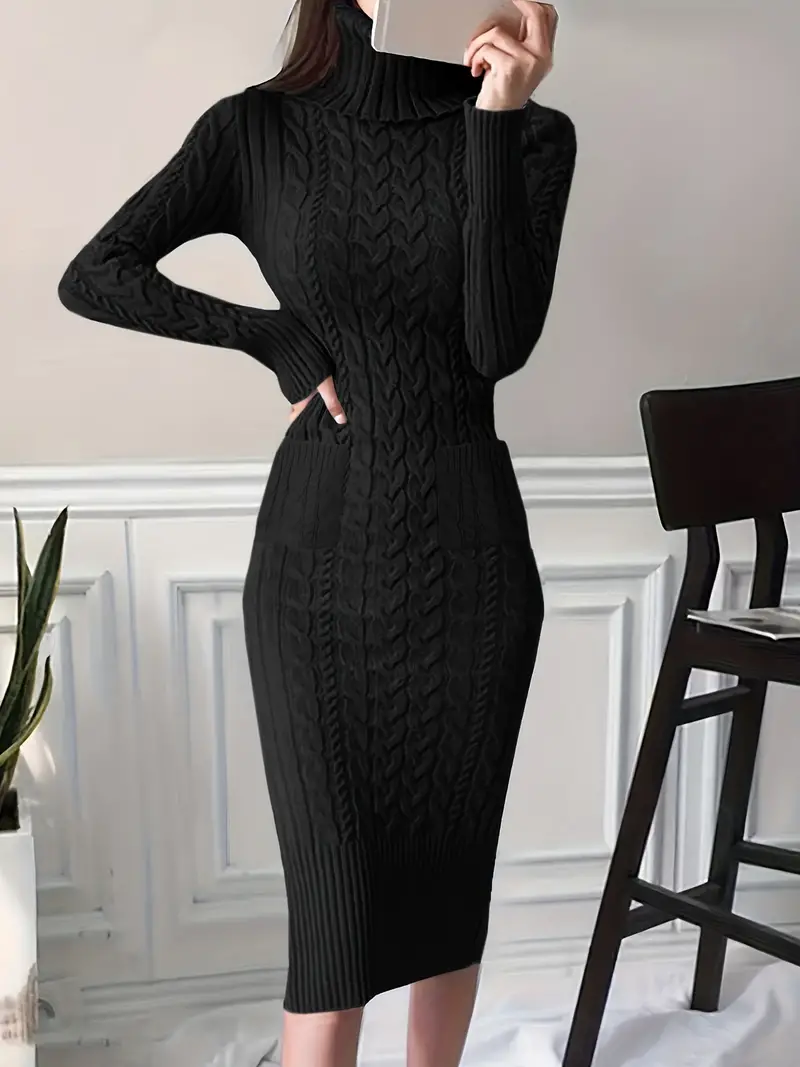 Elégante robe pull mince en tricot de câble avec deux poches