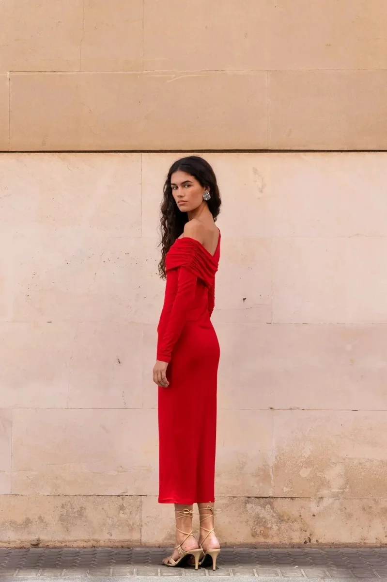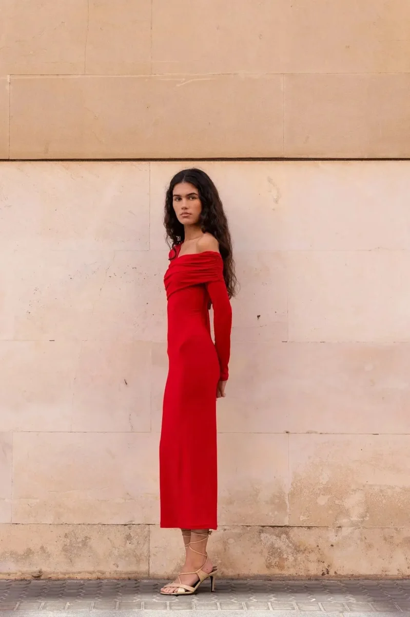 Découvrez la Robe Rouge Moulante à Épaules Découvertes