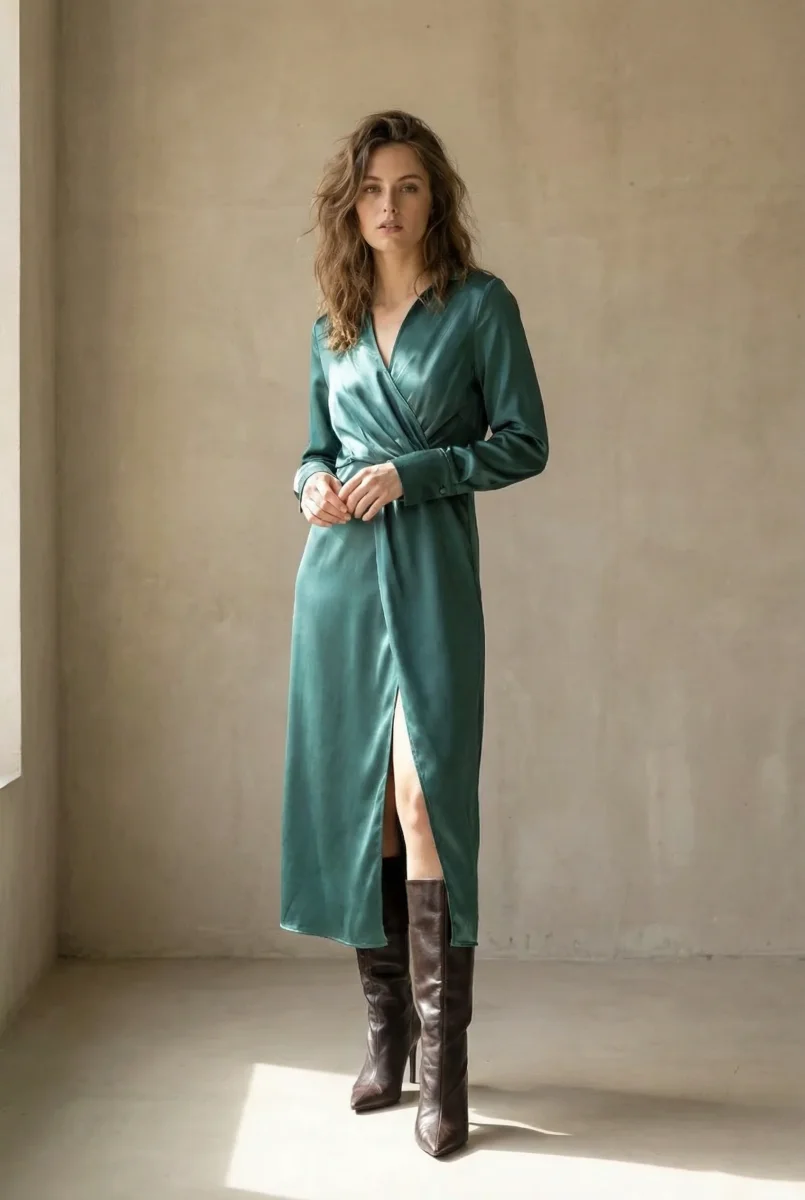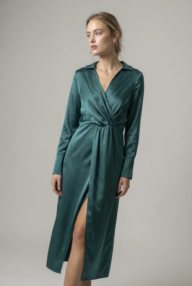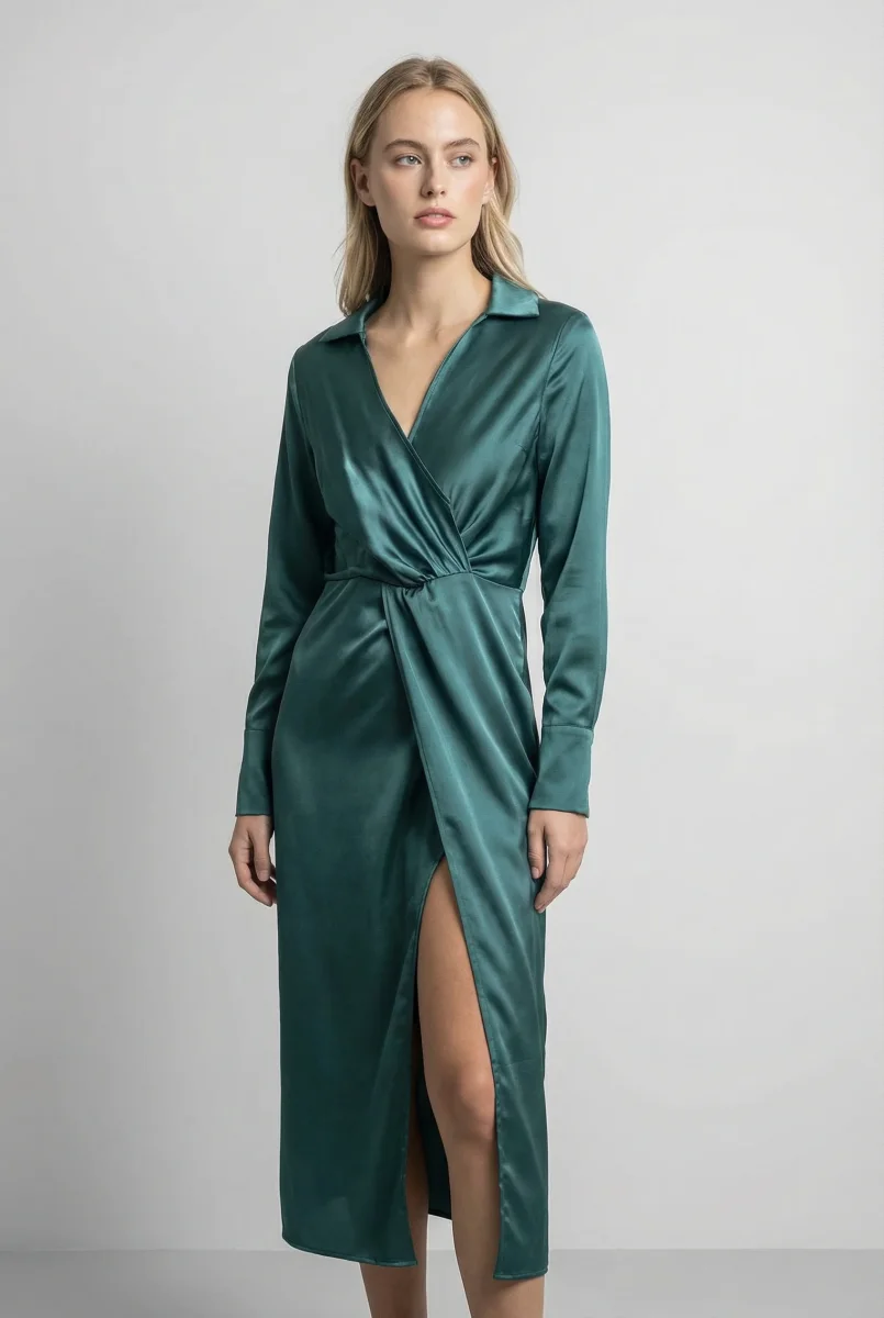 Découvrez la Robe Satin Manche Longue Croisée Midi Sarcelle
